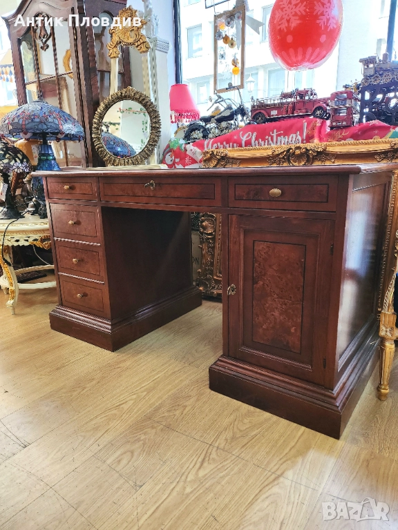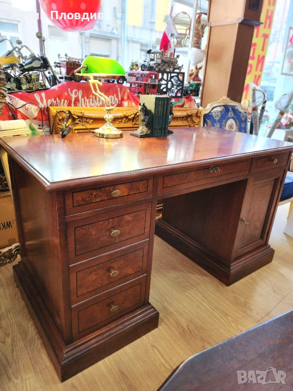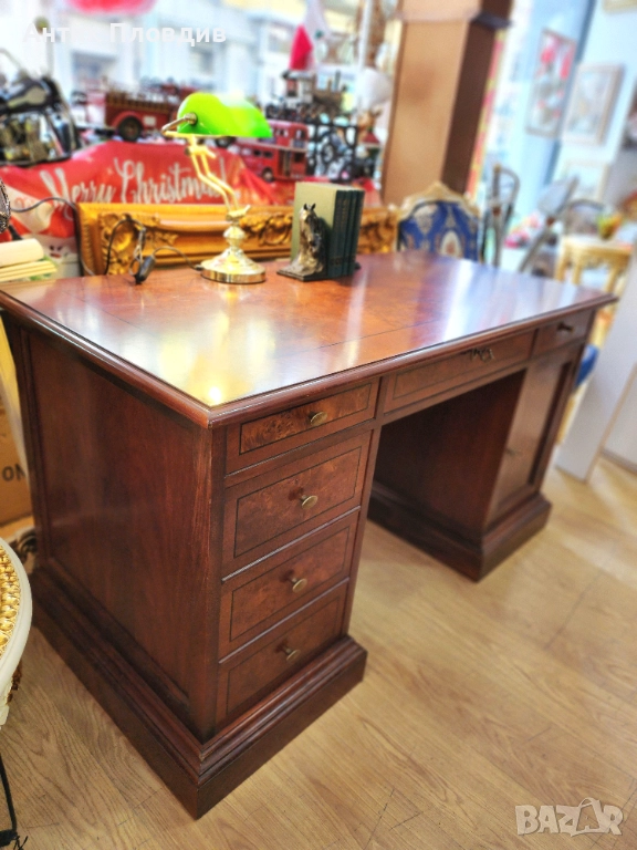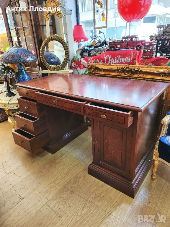 Масивно италианско бюро с правоъгълен плот и симетрично разположени чекмеджета. Изработено от масивно дърво с фурнир и запазено покритие.