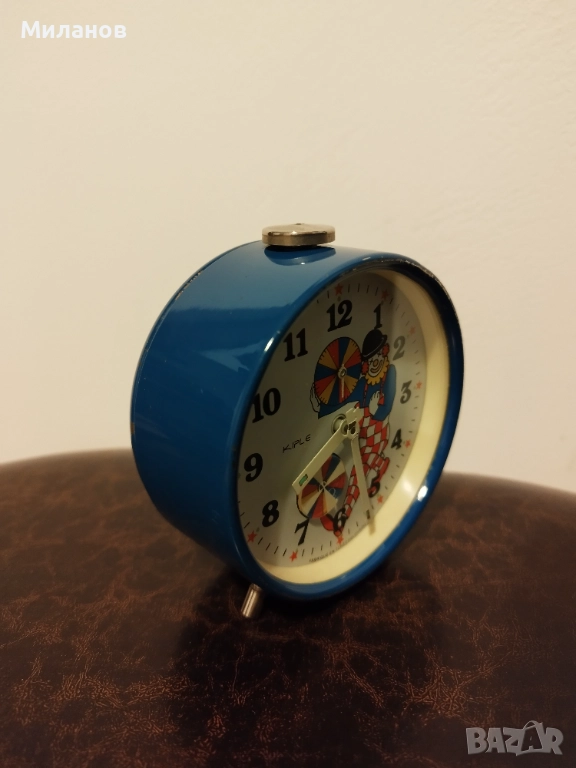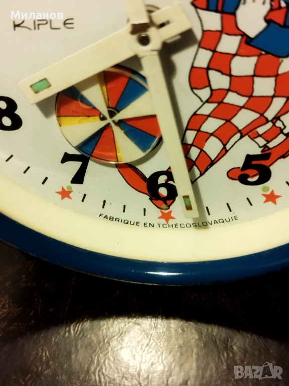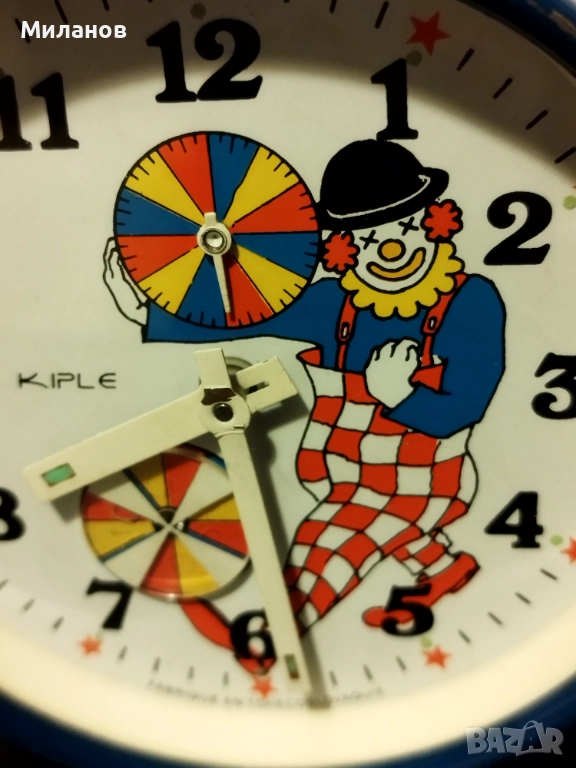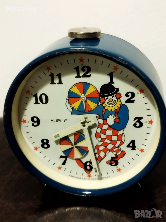 Чехословашки механичен анимиран будилник Kiple.Над 40- годишен.Работи и звъни, в пълна изправност.Диаметър-100 милиметра.Номер на часовника-962791