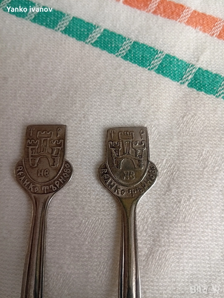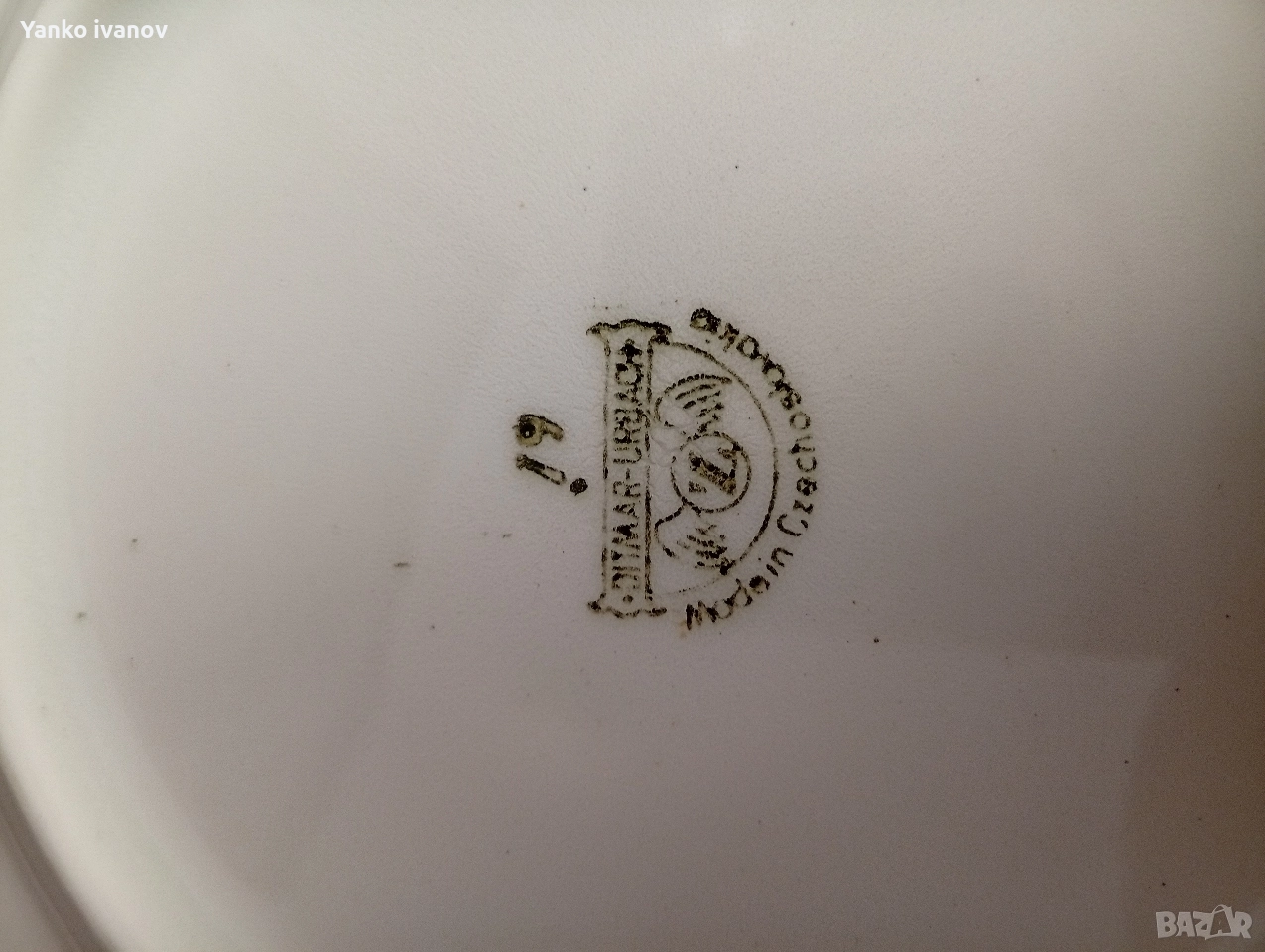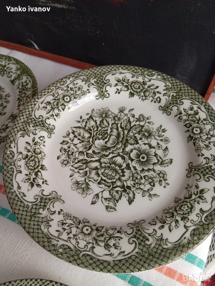 Продавам порцеланов сервиз с интересна шарка включва шест чашки с чинийки, малко по големи чинийки шест броя и шест лъжички. Цената е обща за всичко.