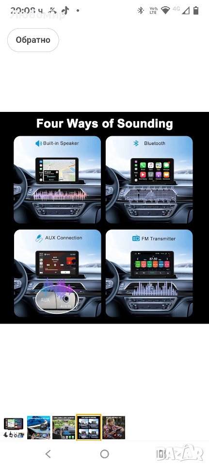 Множество опции за аудио изход: Универсалната система Driveplay предлага различни начини за слушане на аудио, включително Bluetooth за безжично стрийминг към стерео системата на вашия автомобил, както и опции за AUX, FM предаватели и вградени високоговорители. Моля, обърнете внимание, че FM опцията е предназначена единствено за приемане на аудио и не може да предава сигнали. Тази настройка предоставя гъвкави аудио възможности, предоставяйки отличен стерео звук и завладяващо слушателско изживяване, идеално за слушане на любимите ви музикални приложения.