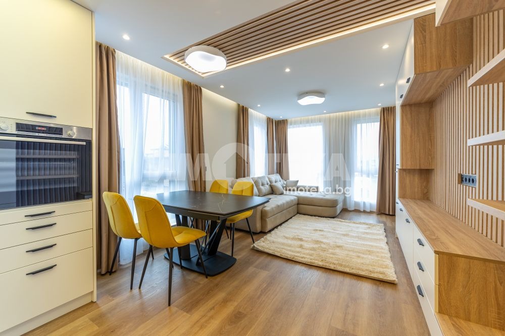 Апартаментът е напълно обзаведен и оборудван по дизайнерски проет с висок клас екектроуреди, мека мебел, спални. Обзавеждане в цвят шампанско и светло дърво с функционално разпределение на шкафчета, рафтове, етажерки и закачалки в гардеробите. Пералня и сушилня Miele. Голям телевизор и елегантна кухненска маса /естествен камък/, лед осветление, опънати тавани. Настилки SPC. Имот обзаведен с много вкус и мисъл за всеки детайл.