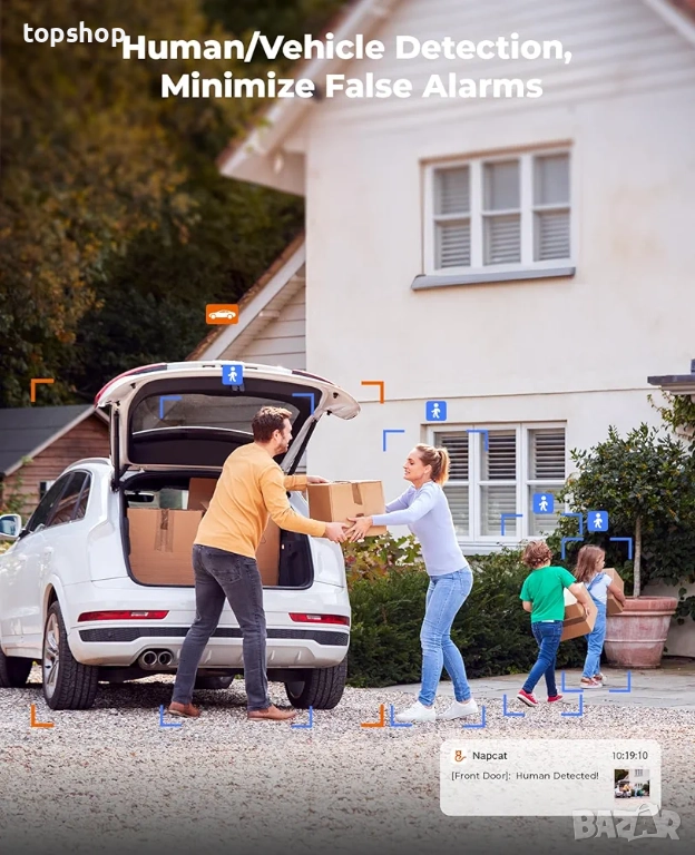 [Точни сигнали] Системата за видеонаблюдение открива хора и превозни средства за прецизно откриване на движение, намалявайки фалшивите аларми. Тя също така разполага с функция за откриване на поведение, като например проникване и пресичане на линия, което ви позволява да персонализирате настройките, за да дадете приоритет на нещата, които наистина имат значение.