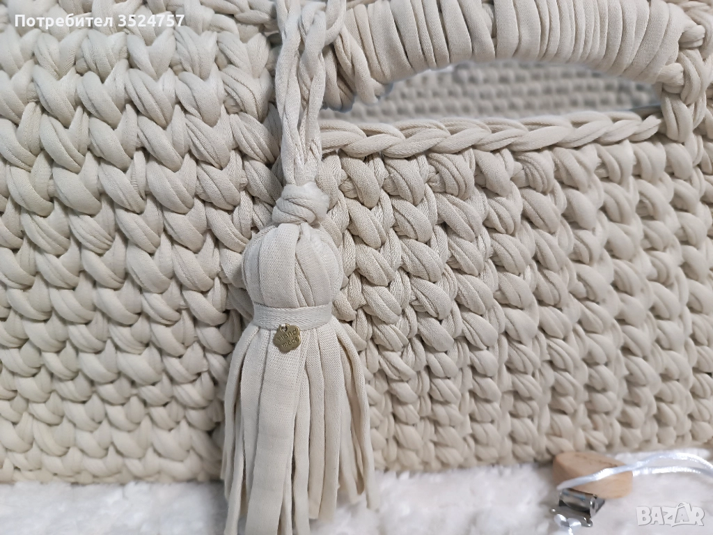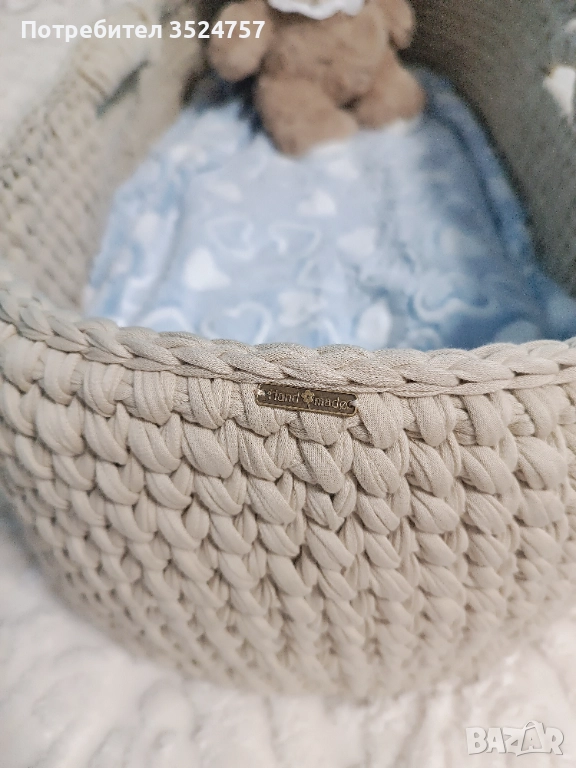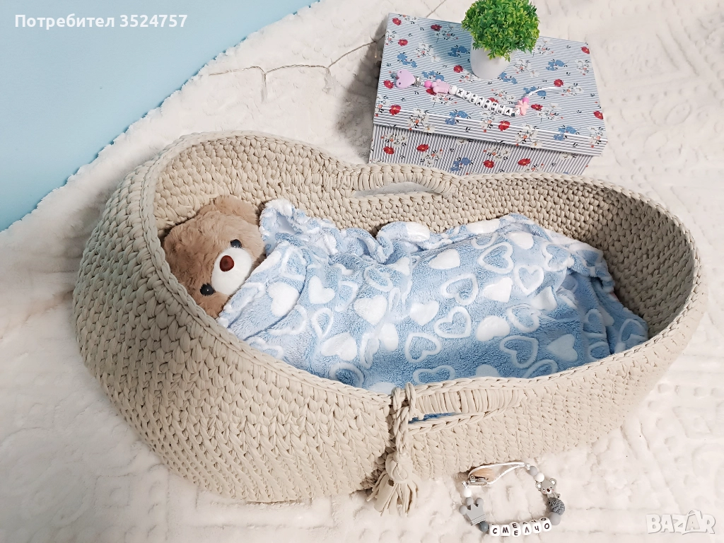 Продавам ръчно изплетено бебешко кошче тип Мойсей, дължина 70 см, с включено меко матраче.