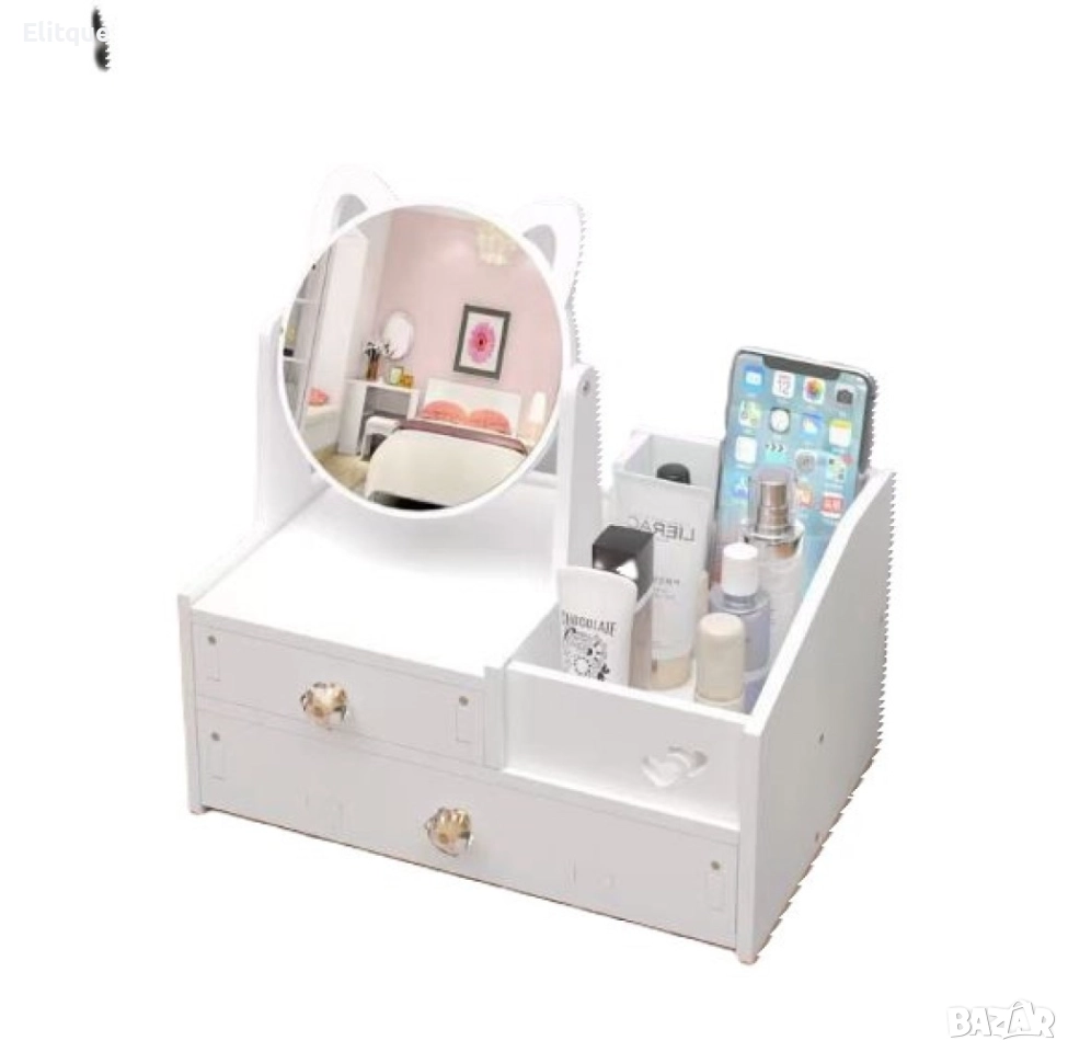 Материал: Дървесно-пластмасов композит; Цвят: Бял; Дебелина на дъската: 5 мм; Размери: 28 см (ширина) x 20 см (дълбочина) x 16 см (височина); Размер на огледалото: Диаметър 16 см;Размер на чекмеджетата: 28 см (ширина) x 4 см (височина) и 28 см (ширина) x 5 см (височина); Отделение за аксесоари: 16 см (височина).