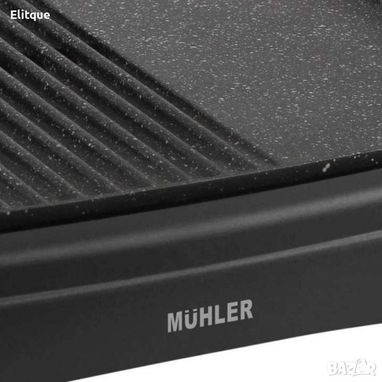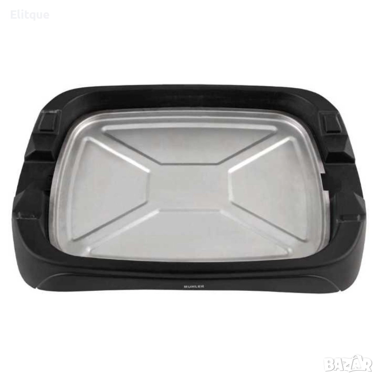 Плоча от лят алуминий (1/2 оребрена, 1/2 гладка) Мраморно покритие Подсилен стъклен капак Размер на плочата: 40 х 30 сm Подвижен захранващ кабел и регулируем термостат Дренажен отвор и тавичка за мазнина Възможност за печене на грил с по-малко дим, благодарение на тавичката за вода под работната плоча