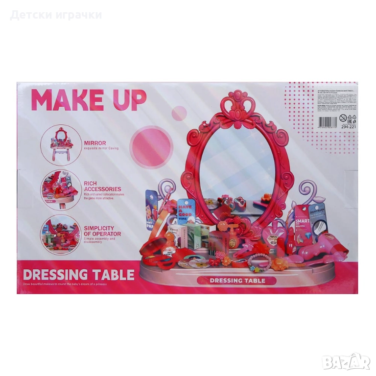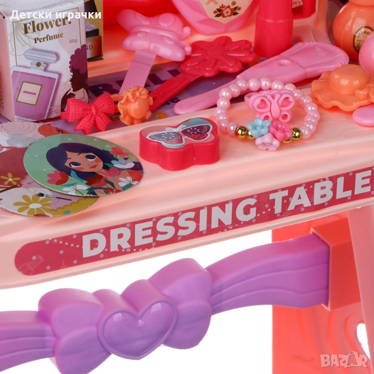 тоалетка Mini Professions, състоящ се от 46 части, включва тоалетно шкафче с огледало и богат асортимент от аксесоари - от сешоар и гребен до халки и фиби за коса.
