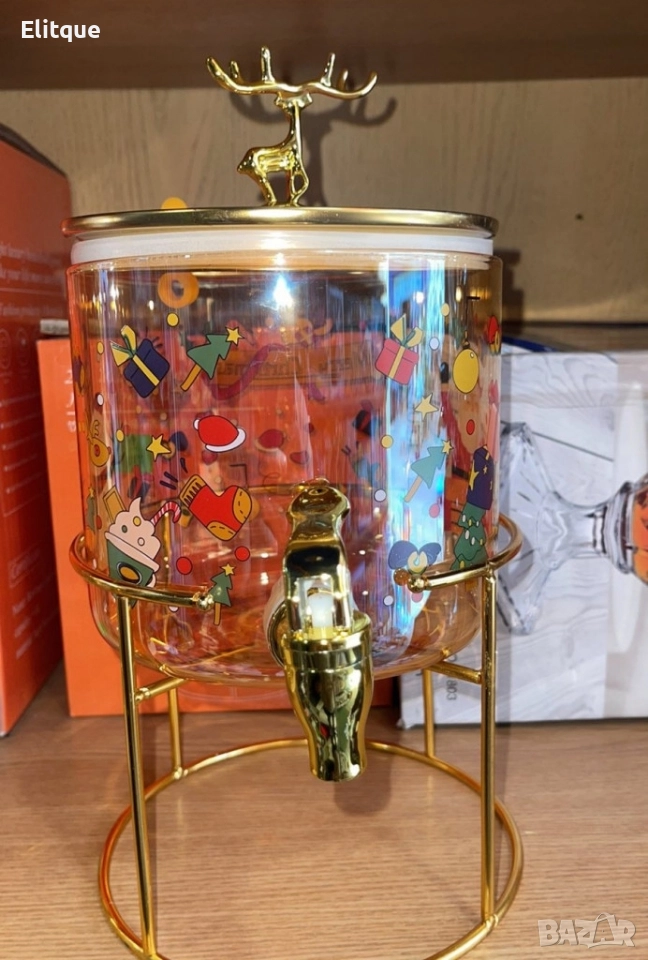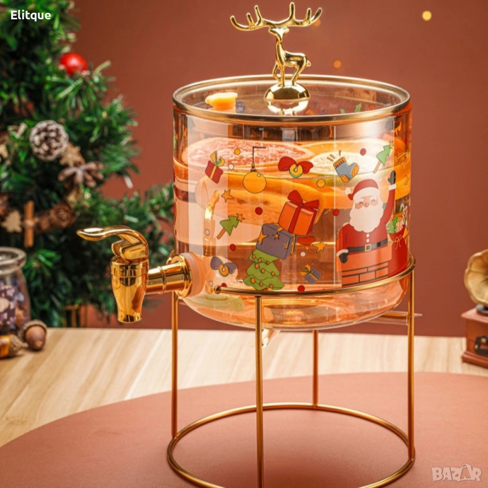 Стъклен диспенсър за напитки 2.6 L с коледен дизайн и златиста стойка