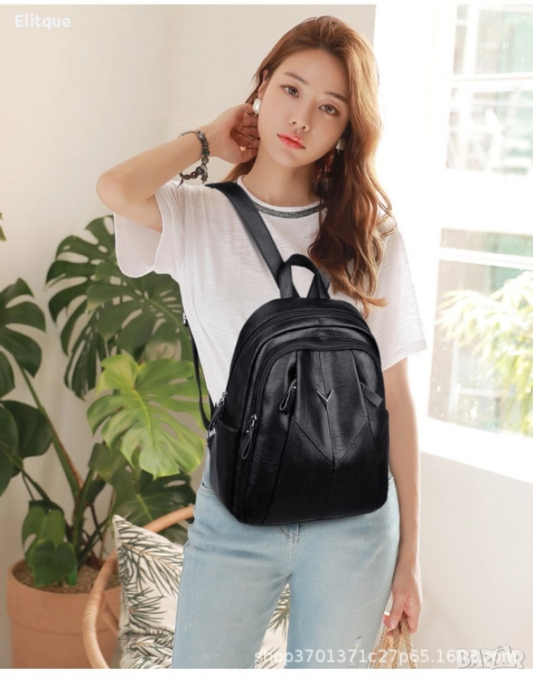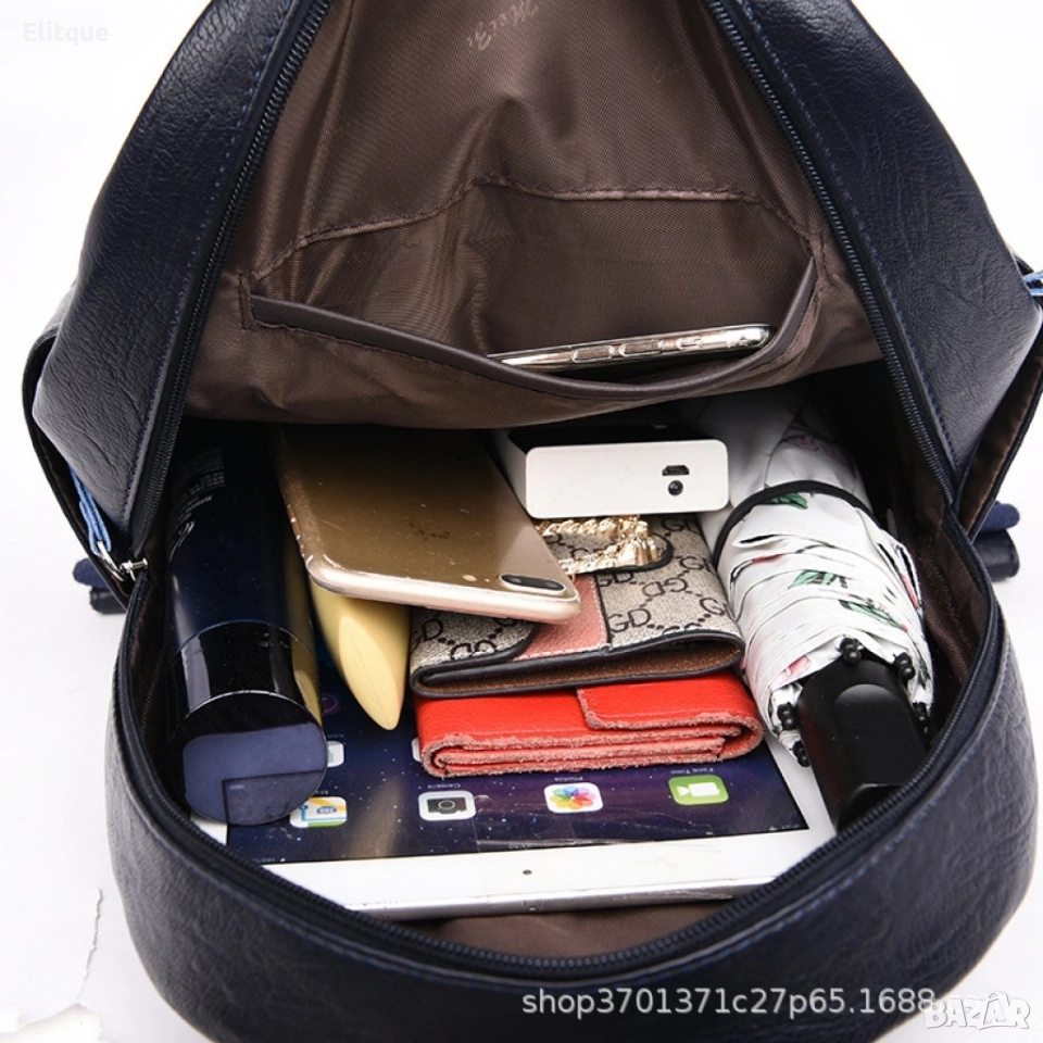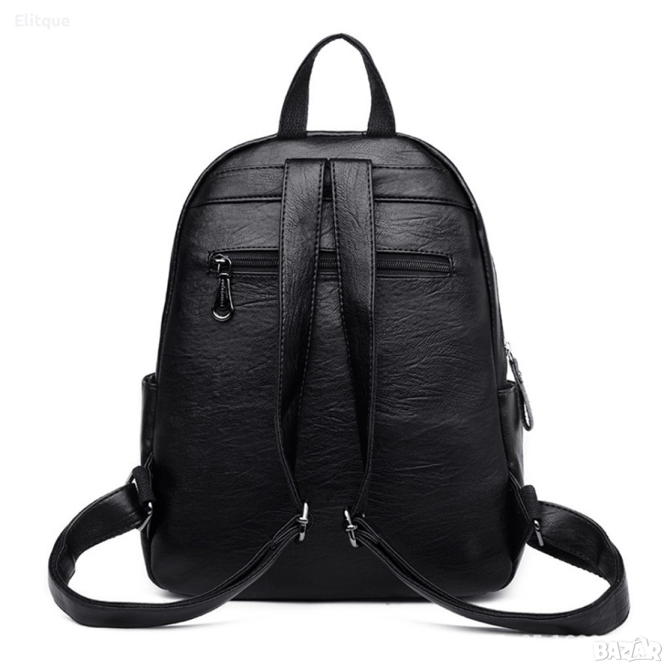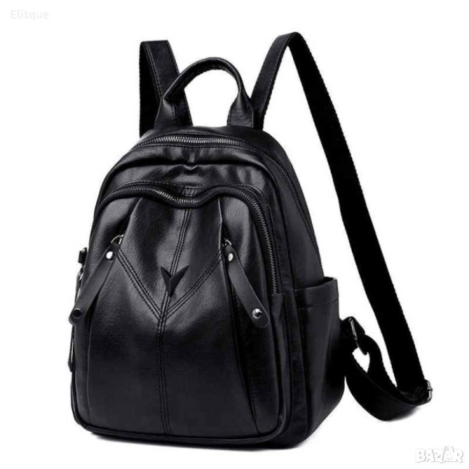 Комплект 3 части дамска раница, чантичка и портмоне /Височина: 32 см; Ширина: 26 см; Дълбочина: 11 см./Раницата е в комплект с мини чанта. Мини чантата, е с дълга, подвижна, регулируема дръжка (23см/ 14см / 1см) и портмоне с къса, подвижна дръжка - тип “гривна“( 17см/ 12см /1см). /Цвят: Черен