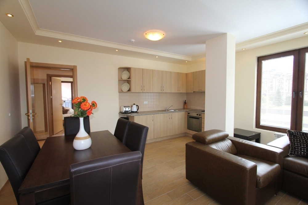Имотът се състои от антре, слънчева и просторна дневна с кухня с вградена фурна с котлони, абсорбатор , хладилник ,трапезна маса със столове, диван, фотьойли, холна маса, телевизор . От дневната се излиза на голям балкон с югозападно изложение с прекрасна гледка.