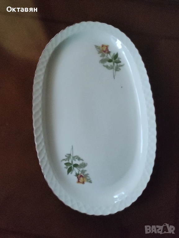 Старо елипсовидно плато с червен кант на Изида, маркирано, отлично за годините си, без счупено или чипове, размери-36/22 см. Цена- 6 евро.