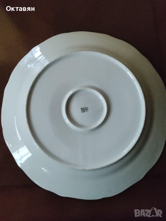 Голямо винтидж кръгло бароково плато с флорален декор и златист кант на Изида, като ново, без следи от употреба, маркирано, диаметър-31.5 см. Цена-8 евро.