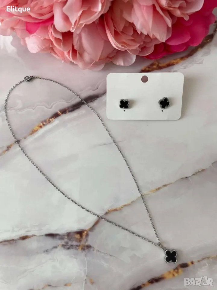 Сет/Комплект JL Famous Clover Silver Black 1101 19.90лв. (10.17€) Материал: Изработени от неръждаем метал Дизайн: Цвят метал- сребрист, цвят декорация – черен . Сетът включва