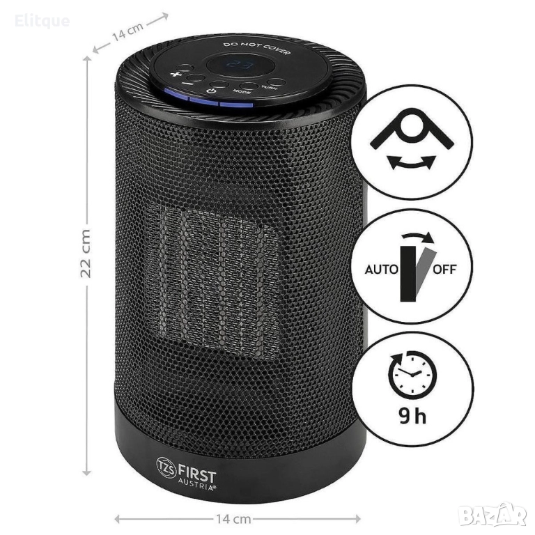 Мощност: 1200W; Нагревателна Система: Керамика / PTC; Нива на Отопление: 2 (600W / 1200W); Регулируема Степен на Нагряване; Ниво на Скорост: 1; Материал на Корпуса: Пластмаса; Защитно Покритие: Решетка; Температурен Дисплей; Таймер; Превключвател за Преобръщане; Ниво на Шум: 49 dB; Цвят: Черен; Основно Напрежение: 220-240V; Размери: Ш: 14 см x В: 22 см x Д: 14 см; Тегло: 1.1 кг; Дължина на Кабела: 140 см.