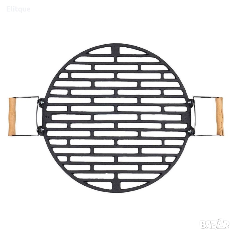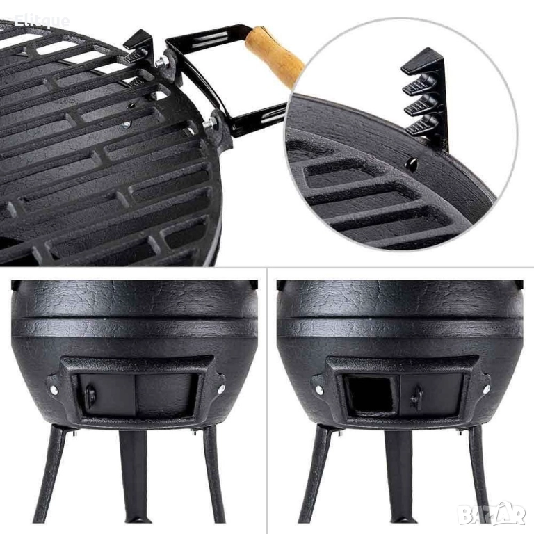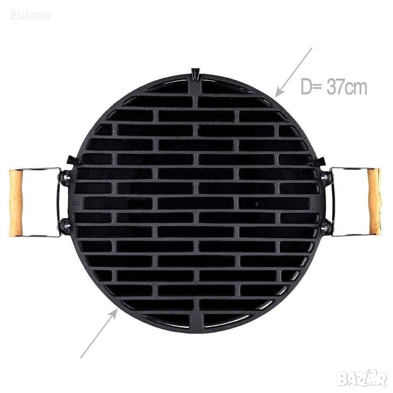 Размери: 37 x H48 см; Диаметър на Скарата: Ф 37 см; Материали: Чугунено тяло и чугунена скара с дървени дръжки; Регулируема Височина на Скарата: За контрол на интензивността на топлината.