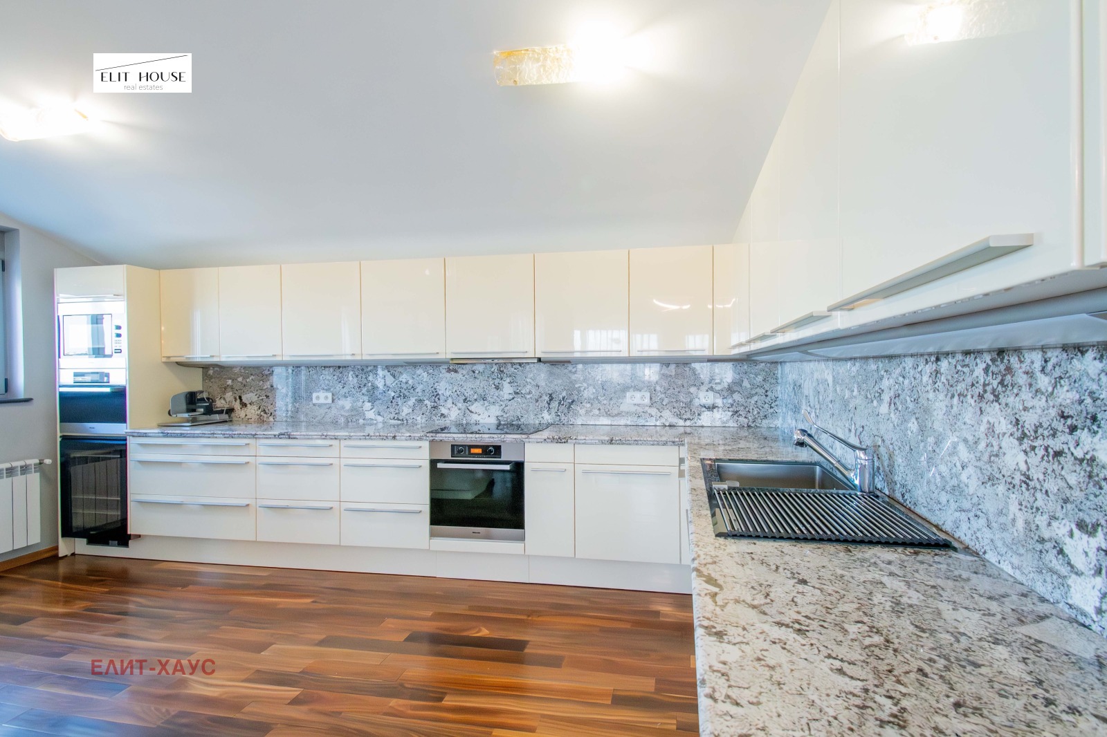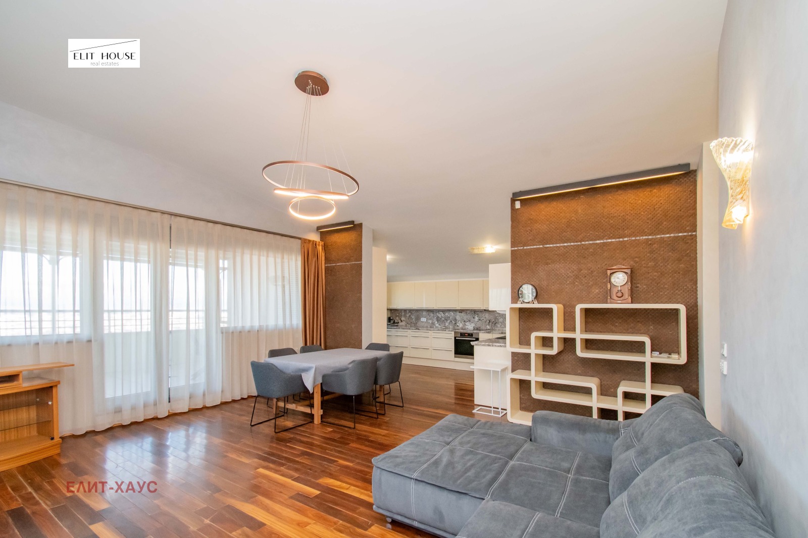 Настилките в апартамента са естествен паркет Орех, камък, интериорни италиански мазилки, мебелите са нови, кухненски плотове от Мрамор;