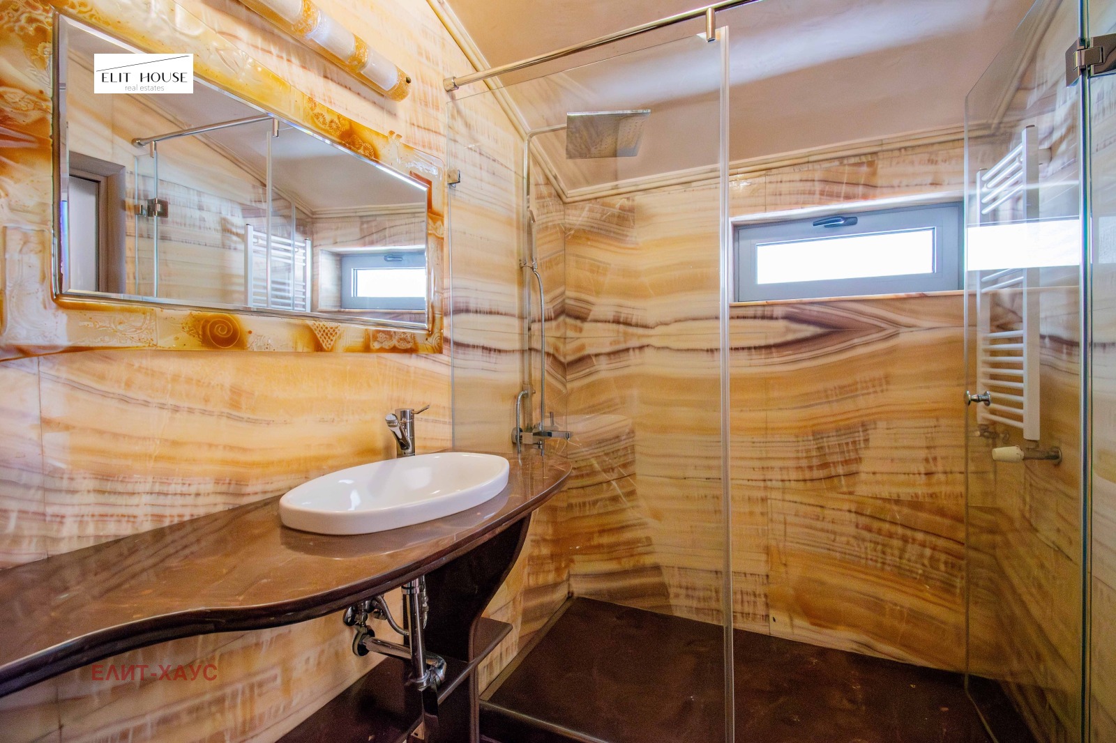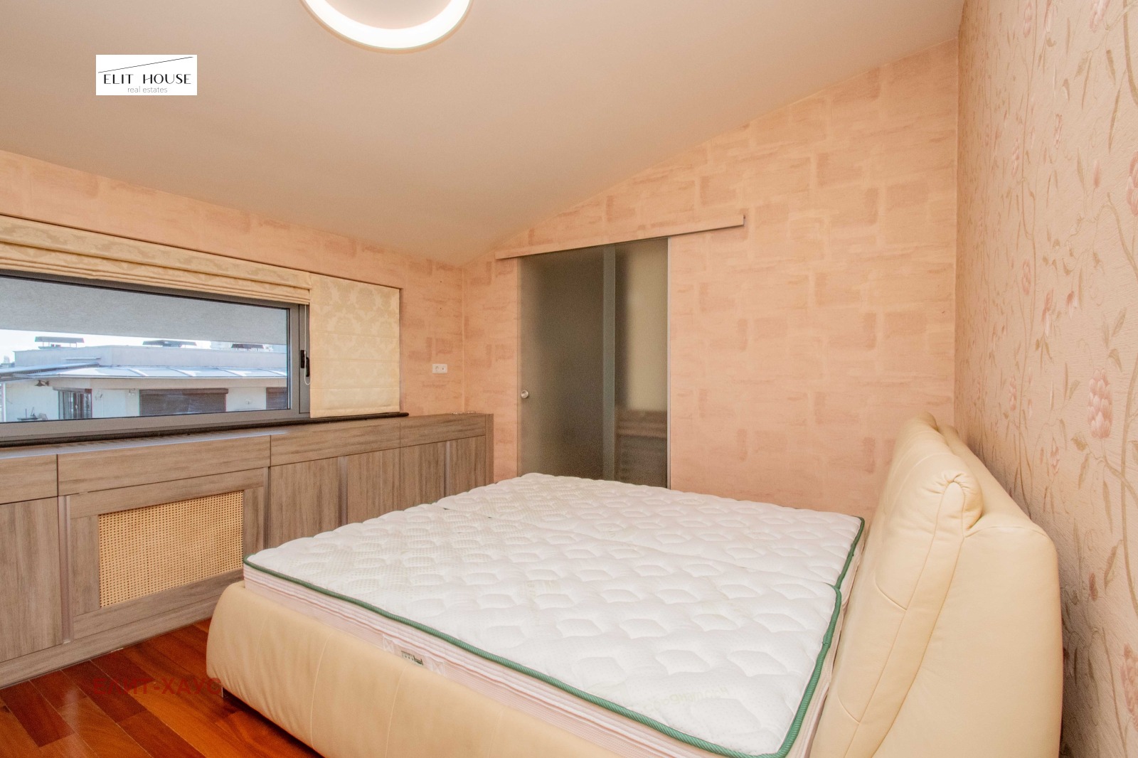 Разпределението е следното: входно антре, голям дрешник, тоалетна за гости, родителска спалня със самостоятелна баня на естествен мрамор, голям дрешник;