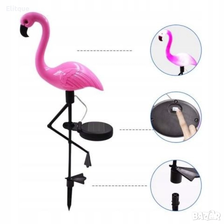 Тази интересна соларна лампа ще добави чар към вашата градина. Оборудвана е с автоматичен сензор за здрач, което означава, че светодиодите се включват или изключват автоматично, без да е необходимо досадно превключване на режима на работа. Лампата не изисква допълнителен източник на захранване. Оборудвана е с 1.2 V AA 600mAh батерия. Върхът на лампата е скрит вътре в крака – за да забиеш лампата в земята, първо трябва да бъде правилно прикрепена към стойката. Капакът на лампата се отвива – вътре има LED крушки и място за батерията. Соларното фламинго има водоустойчива конструкция, което гарантира продължителна употреба при различните атмосферни условия.