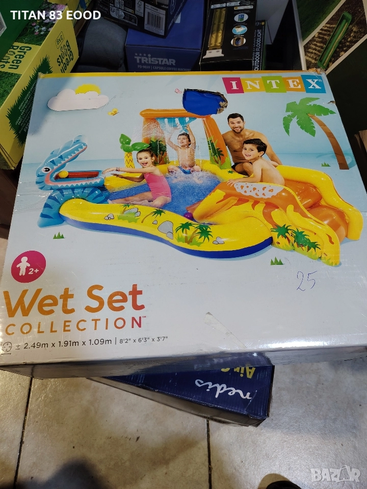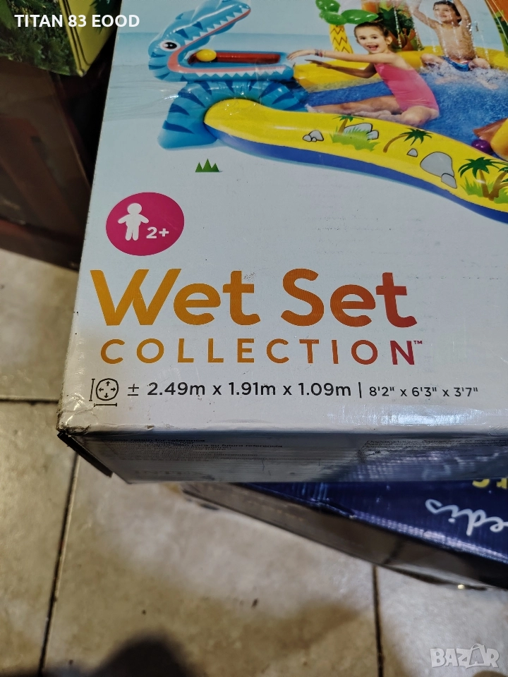 С максимален капацитет на натоварване от 81 кг, няколко деца могат да играят в басейна едновременно. Този надуваем басейн е с тема динозаври. Благодарение на голямата повърхност на басейна, децата могат безопасно да се плъзгат в детския басейн. Топки "Fun Ballz" могат да се хвърлят в устата на динозавъра, докато децата се пързалят. Разпръсквачът с палми и водопадът охлаждат децата, а водният поток може да се регулира с контролния вентил. Включен е и комплект за ремонт.