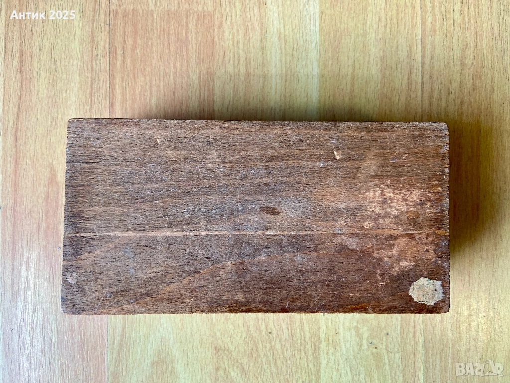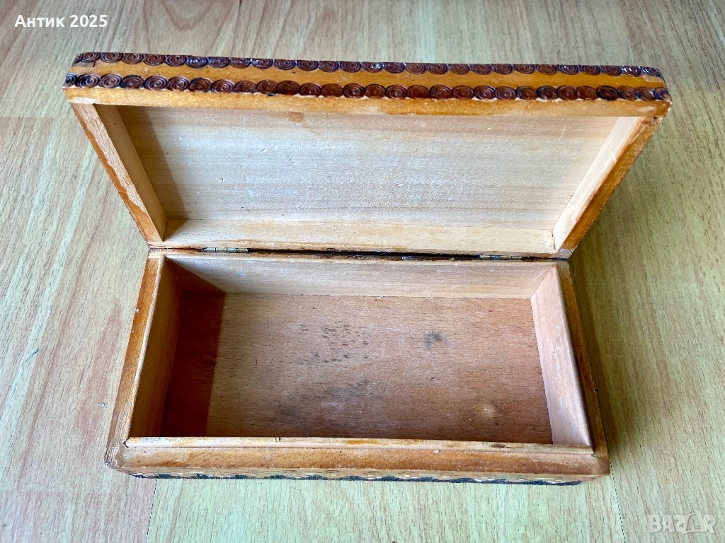 Старинна правоъгълна дървена кутия, ръчно изработена, с богато декориран капак в топли кафяво-оранжеви тонове, украсен с извити завитъци, сърца и растителен орнамент в народен стил. Релефната резба по краищата и цветната живопис придават обем и текстура на повърхността, което прави кутията ефектен декоративен акцент в интериора и я прави подходяща за съхранение на бижута, малки сувенири или паметни дреболии. Състоянието е винтидж/старинно, с естествени следи от времето, които подчертават автентичния ѝ характер и я правят интересна за колекционери и любители на фолклорното изкуство и етнодекора.