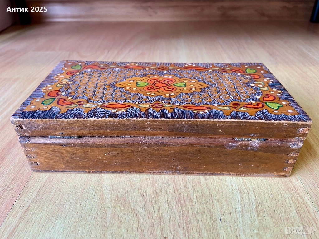 Старинна дървена кутия с ярък народен орнамент