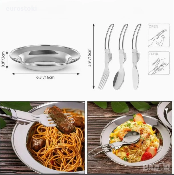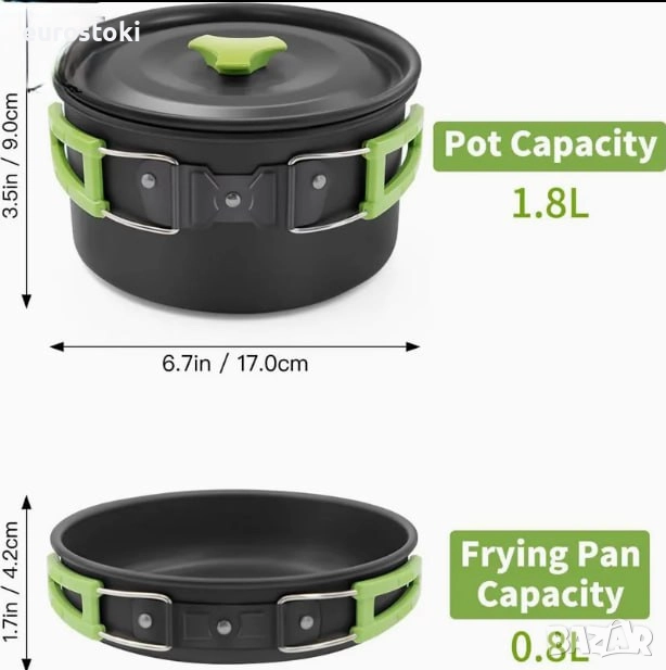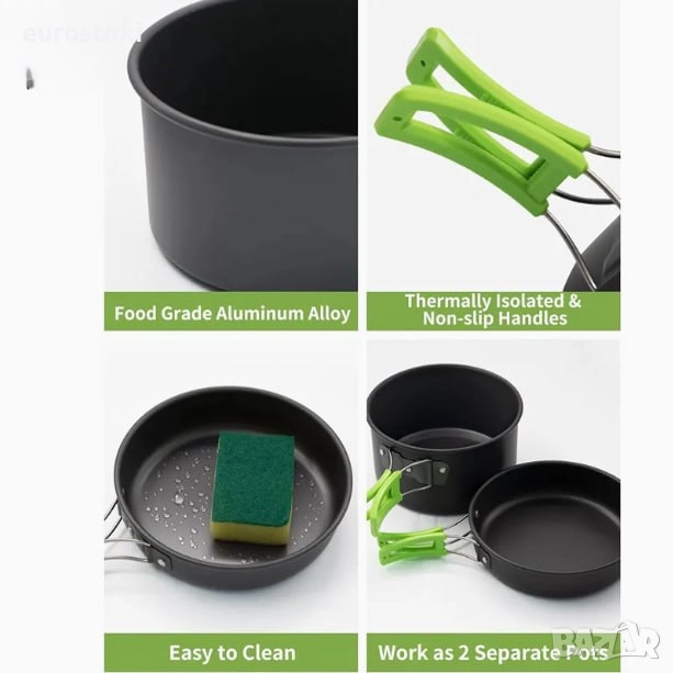 Тенджерите, тиганите и чайници са изработени от висококачествен анодизиран алуминий безопасен и нетоксичен, лек и здрав. Чинии и лъжицата са изработени от материал, подходящ за храна. Всички прибори са нетоксични и здравословни за вашето тяло.
