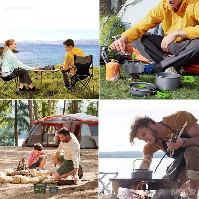 Комплект за готвене на къмпинг, лек алуминиев комплект за готвене на открито, подходящ за къмпинг, туризъм и готвене (зелен).
