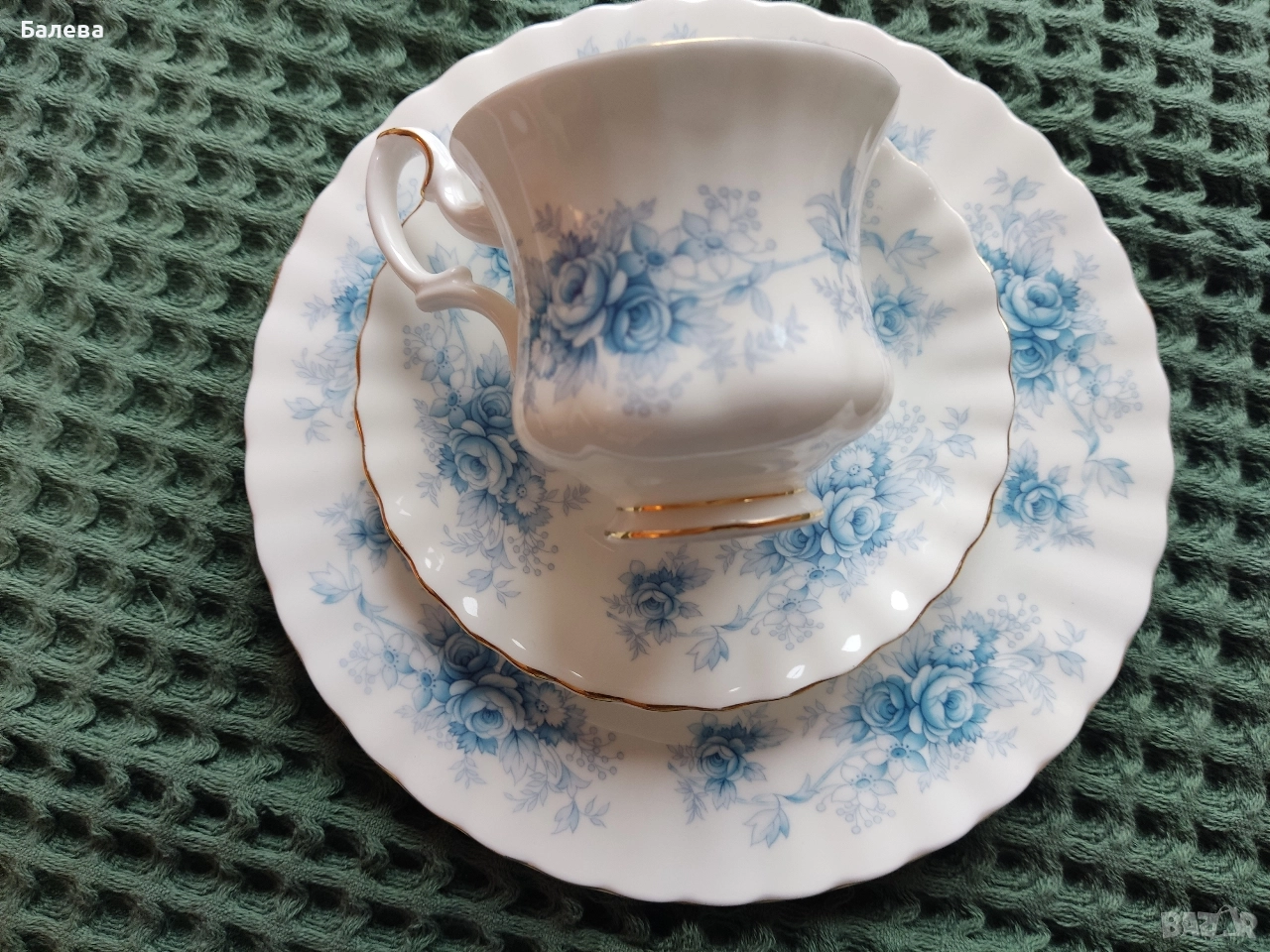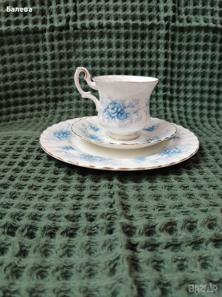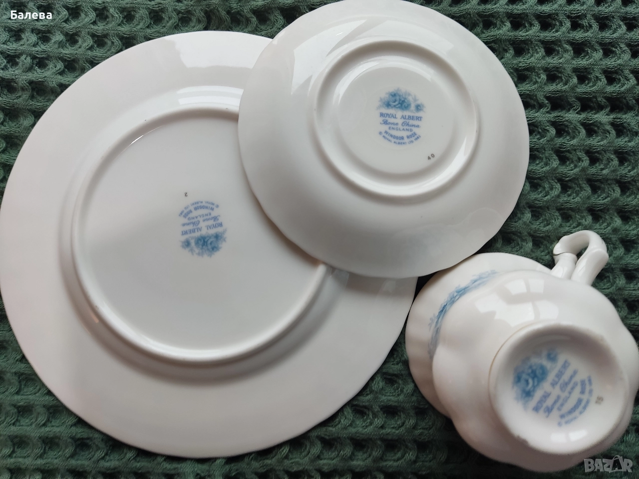 троен сет за кафе на марката Royal Albert, серия Windsor Rose от 1982 г. Изключително лек, тънкостенен и фин английски порцелан. Вместимост на чашката - 130 мл, диаметър на десертната чиния - 18 см, диаметър на подложната чинийка - 12 см. Без забележки.