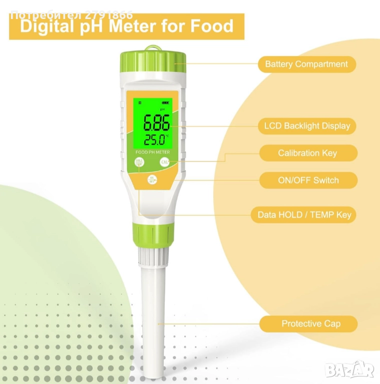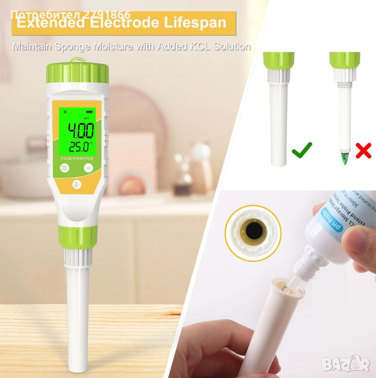 - Надежден и точен pH тестер за храни: Нашият дигитален pH тестер използва усъвършенствани чипове, които осигуряват стабилна стойност на измерването, и разполага със система за автоматична температурна компенсация (ATC), която осигурява точни измервания, независимо от температурните промени. В допълнение, към защитния капак на цифровия pH метър е добавена влажна гъба, напоена с разтвор на KCL, за да поддържа сондата влажна през цялото време, което значително удължава живота на pH тестера.