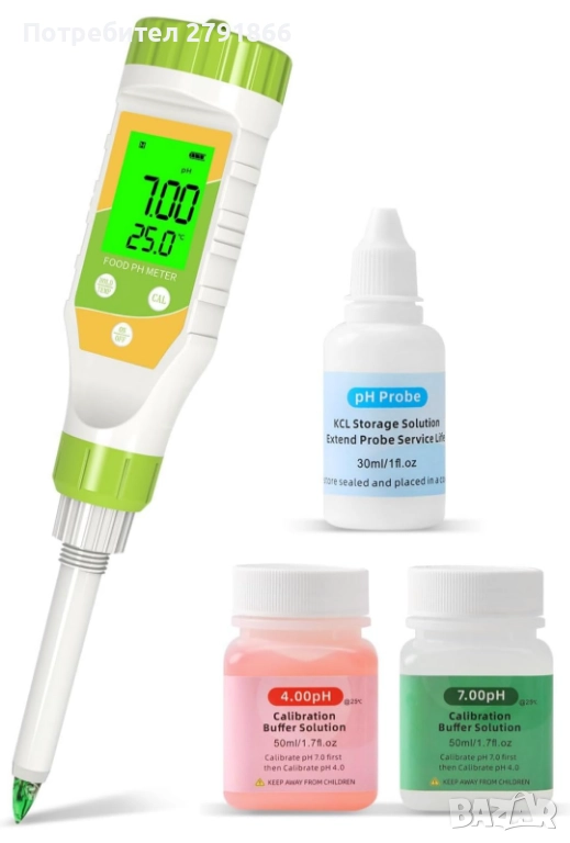 pH метър за храни с разтвор за калибриране на pH