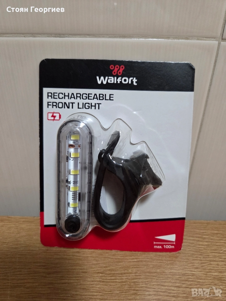 акумулаторната предна светлина за велосипед е с обхват на лъча до 100 метра. Продуктът обикновено се предлага с гъвкава силиконова скоба за монтиране на кормилото. Характеристики Тип: Акумулаторна предна LED светлина за велосипед. Обхват: Максимален обхват на светлинния лъч до 100 метра. Захранване: Зарежда се чрез USB, което осигурява удобство при зареждане от различни източници. Режими на светене: Някои подобни модели предлагат различни режими, включително постоянен и мигащ, за да отговарят на условията на пътя. Монтаж: Включена е гъвкава монтажна скоба, обикновено изработена от силикон или гума, за лесно закрепване.