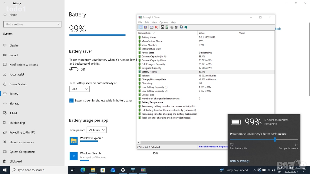 БАТЕРИЯ - 63 Whr Battery, най-голямата за модела, с износване 50%, автономна работа 3-4 часа в зависимост от настройки и натоварване.