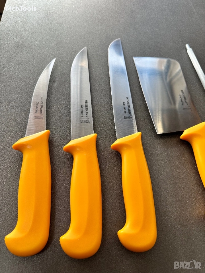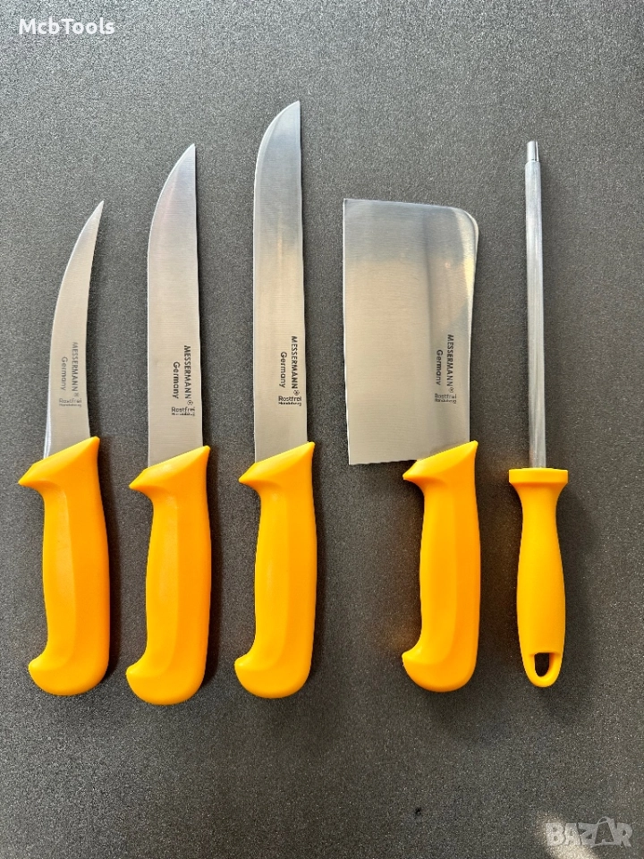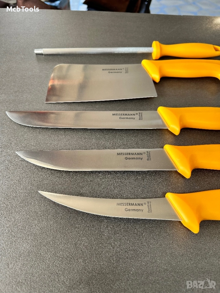 Комплект професионални немски месарски ножове 3 броя със сатър и масат в комплекта, подходящи за транжиране, рязане на зеленчуци, месо и други. Изработени от неръждаема стомана с тройно заточено острие. Подходящи за професионална употреба.