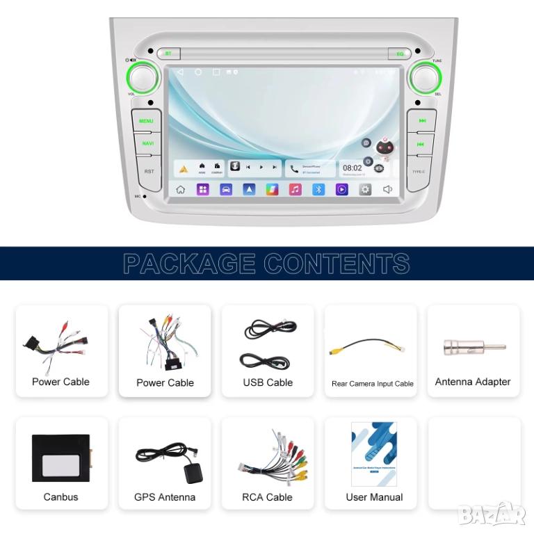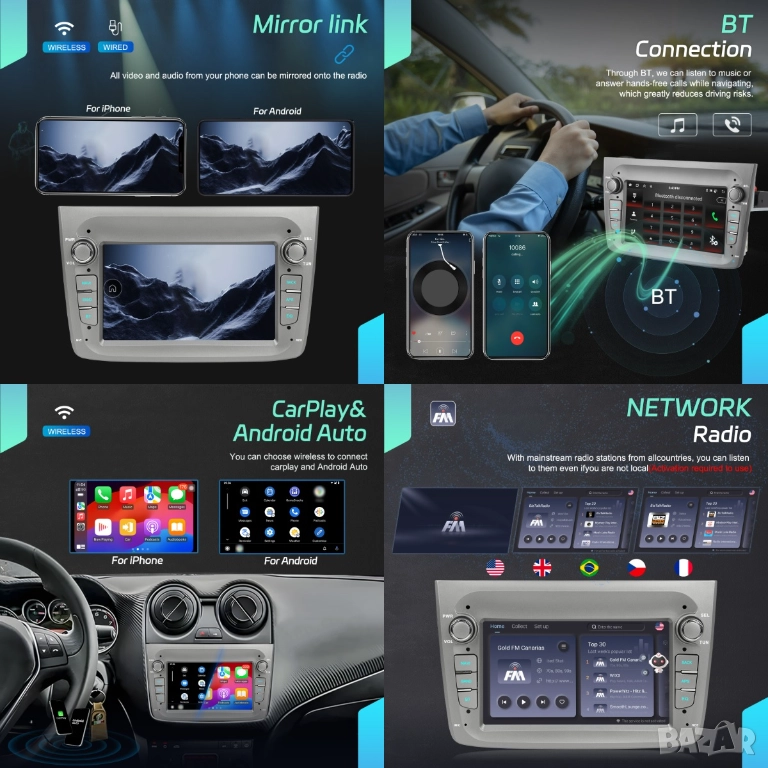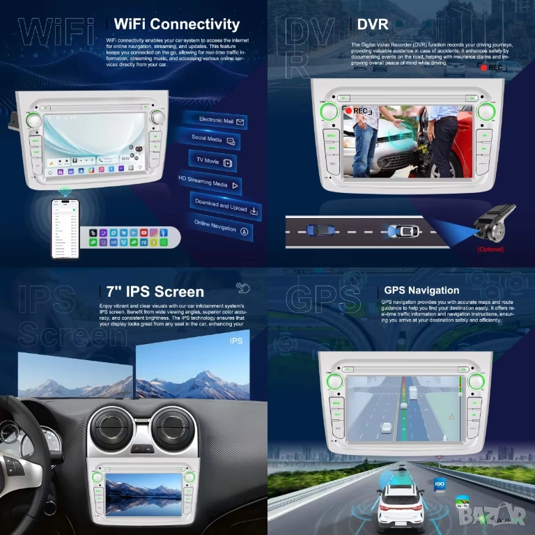 Wi-Fi интернет, новият Андроид, Bluetooth за разговори и музика, USB входове за флашка и зареждане на устройства, GPS навигация, теми за вид на меню, еквалайзер за настройка на звука, бърза реална RAM памет от ново поколение. ТОП дизайн!