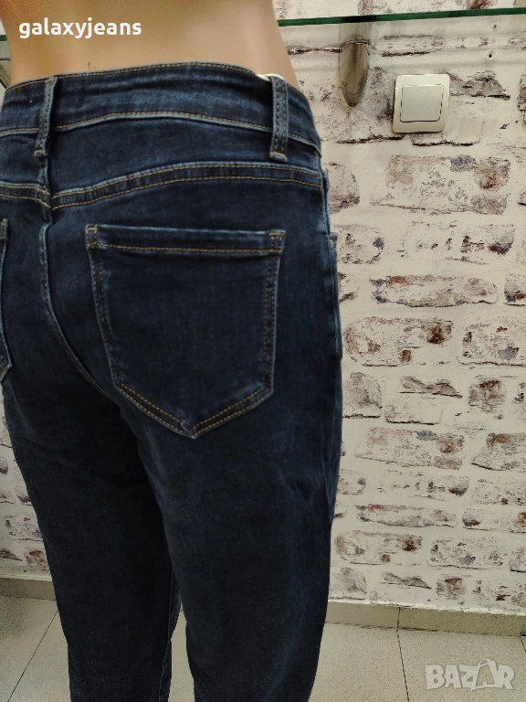 Модел Mom fit, Висока талия, С цип, По- широки в ханша, Тъмни, Почти неизбелени, Изчистени, По- къси, Мек деним с еластан