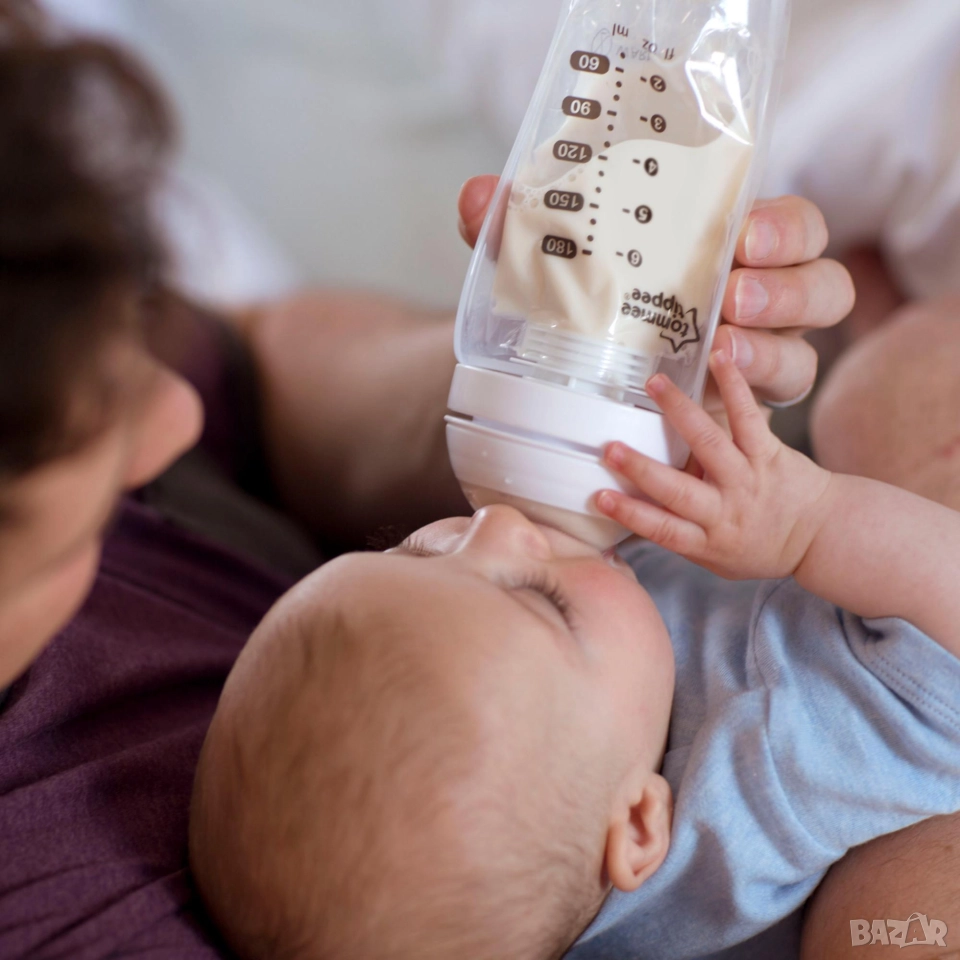 Tommee Tippee Express and Go Complete Starter Kit е иновативна система, която ти позволява да изцеждаш, съхраняваш, затопляш и храниш бебето директно от един и същ плик – без преливане, без разливане и без загуба на ценна кърма.