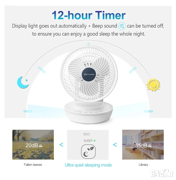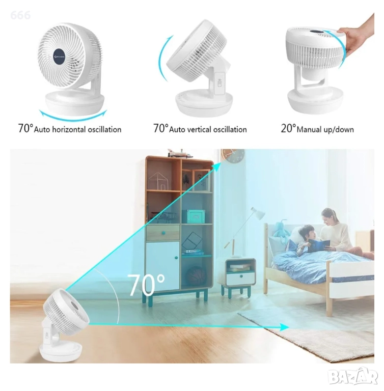 ♥ 12-часов таймер + 3D циркулатор на въздуха♥ Тих настолен вентилатор, който може да достигне време за работа от 1 до 12 часа. Температурната услуга е налична през цялата нощ в спалнята с нощен режим. Настолният вентилатор разклаща главата автоматично на 70° наляво и надясно; нагоре и надолу автоматично на 70° и ръчно на 20°. Циркулация на въздуха с конвекция, компенсация на стайната температура.