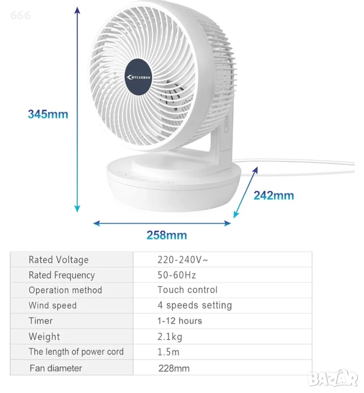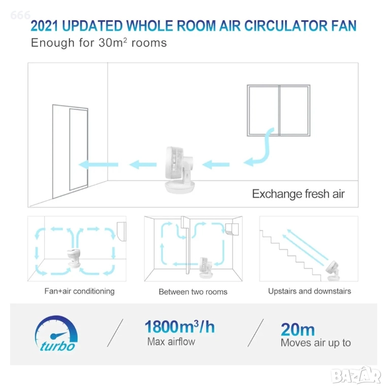 Познавате ли вентилатора за циркулация на въздуха? ♥ Турбо вентилаторът може да създаде конвективна циркулация, която ускорява циркулацията на въздуха. Това актуализира въздуха и балансира температурата в помещението. С аеродинамичния турбо дизайн, производителността на настолния вентилатор може да бъде по-добра от тази на обикновените вентилатори. Турбо настолният вентилатор MYCARBON има по-силна настройка на вятъра: 6,8 м/с; по-голям обхват на вятъра: 18 метра; По-голям обем на въздуха: 1800 м3/ч. Спестява 80% енергия и разходи за енергия.