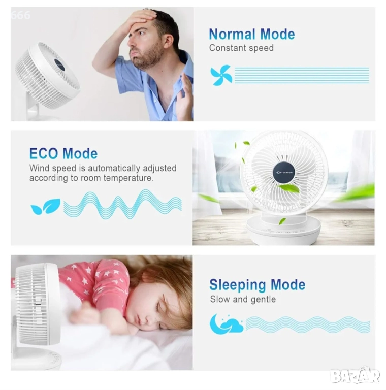 настолен вентилатор + 4 настройки за вятър и 3 вида вятър♥ 1–4 турбо вятър (супер вятър), нормален режим на вятър/естествен вятър/сънен вятър (нощен режим) 3 режима на вентилатора. С тези функции тихият вентилатор отговаря на по-високите нужди от охлаждане. Тихият настолен вентилатор е по-тих от другите вентилатори дори при максимални степени на вятъра. Само 35 dB, тихият настолен вентилатор е идеален за спални.