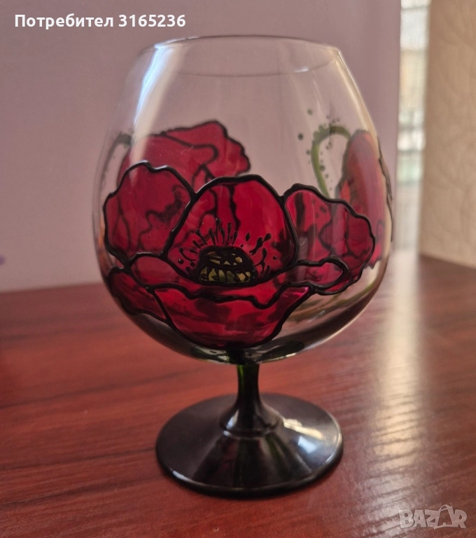 Предаване на лично за гр.Варна! Ръчно рисувана стъклена чаша за свещ с мотив на червени лалета. Чашата е изработена от качествено стъкло и е подходяща за поставяне на чаена или ароматна свещ, за да създаде уютна и празнична атмосфера.