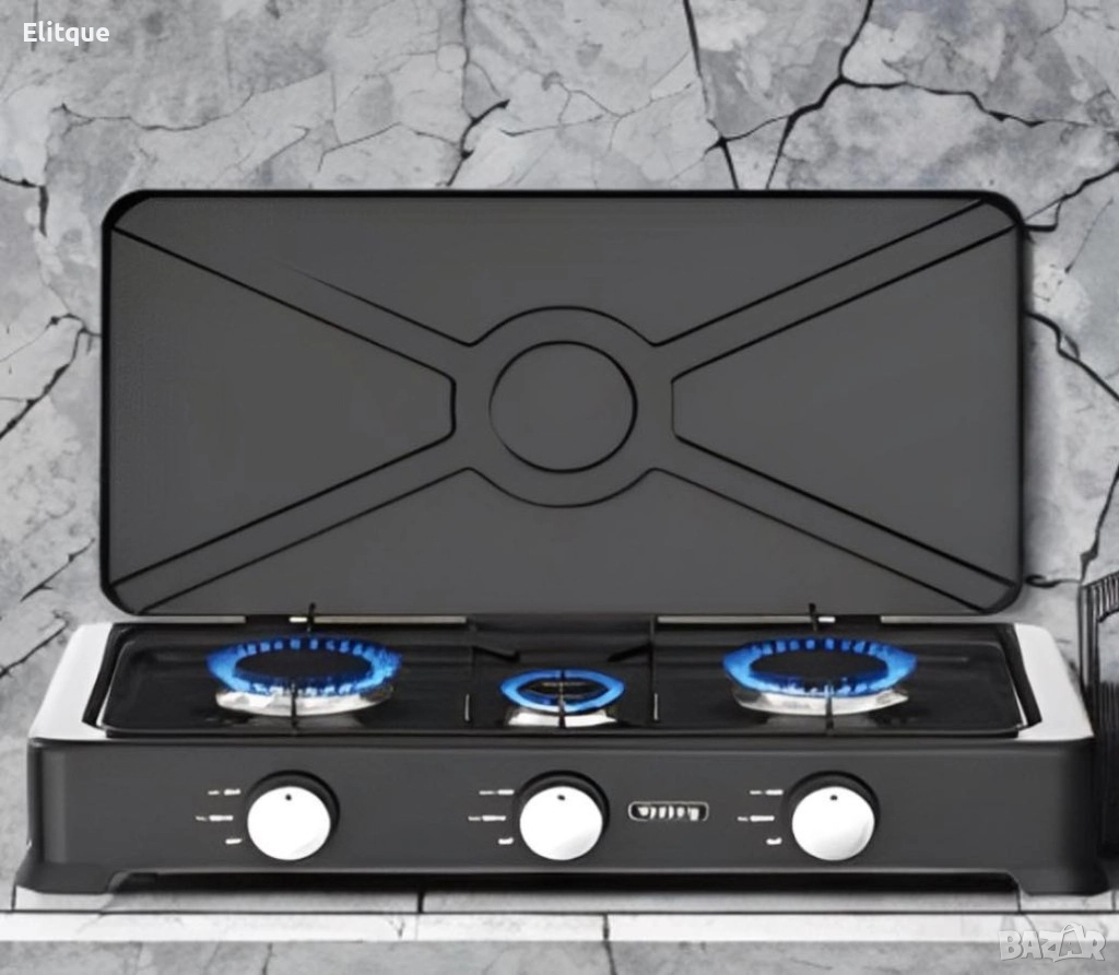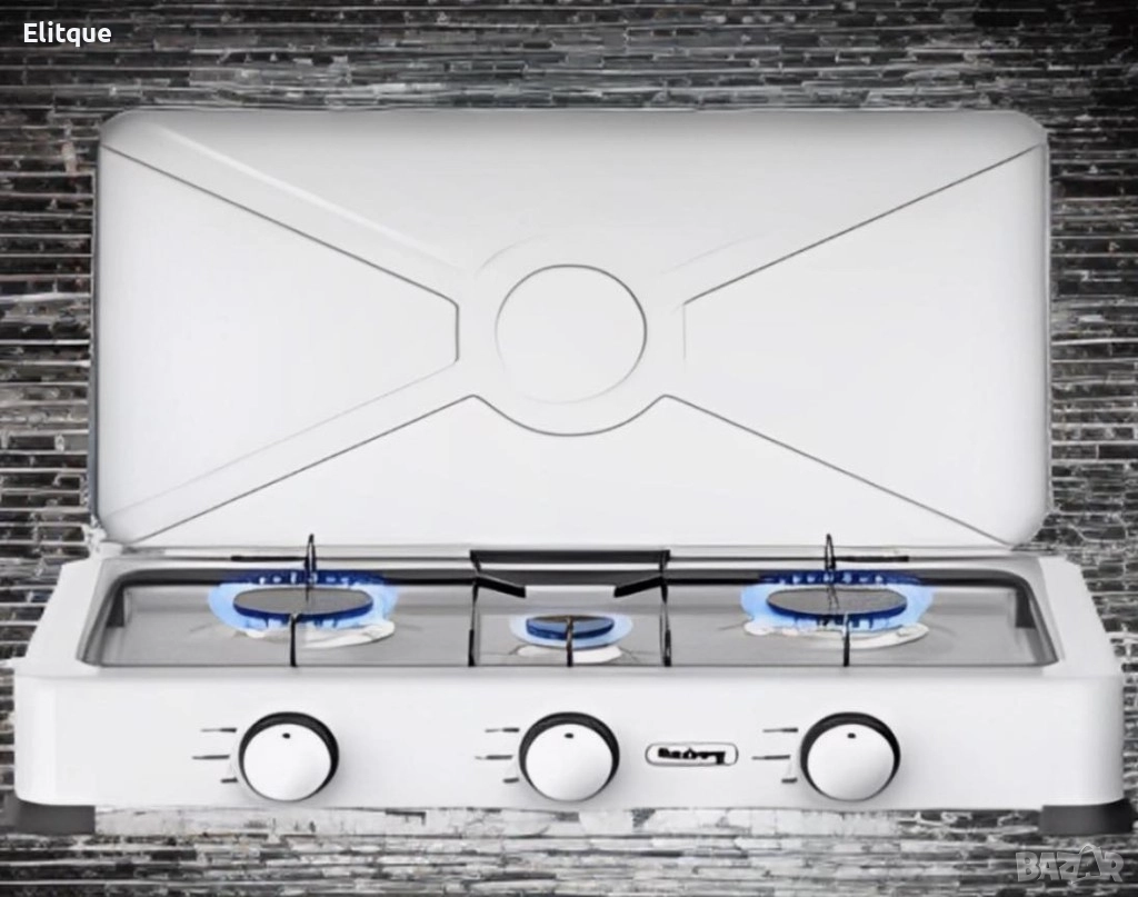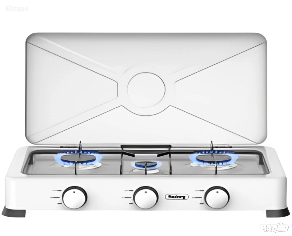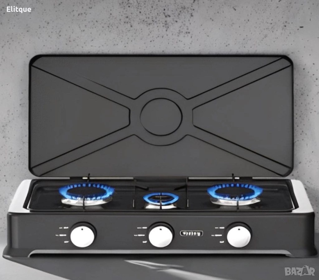Троен газов котлон с капак Боядисан панел от въглеродна стомана Горелка от лят алуминий с емайлирана капачка. Метална скара за тиган. По-добър пламък и по-бързо готвене. Икономичен и мощен. Висококачесвен, безопасен и лесен за използване. Мощност: 2х2.2 kWh+1 kWh. Тип газ: Бутан, Пропан и техните смеси. Налягане: 30 mbar. Размер: 60/33/8.5 см. Уредът е предназначен за използване на открито и проветливо място. Задължително прочетете инструкциите преди да изпозлвате уреда! ВНИМАНИЕ: Някой от частите може да са горещи! Съхранявайте и използвйте далеч от деца!