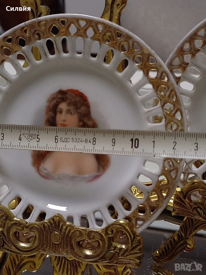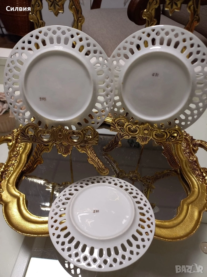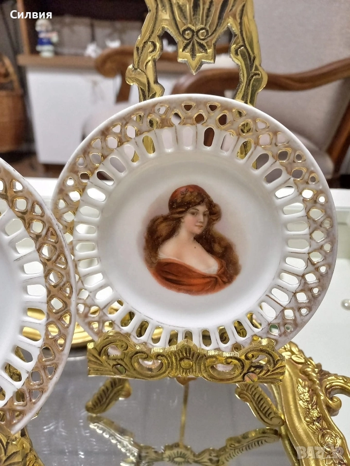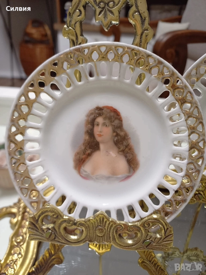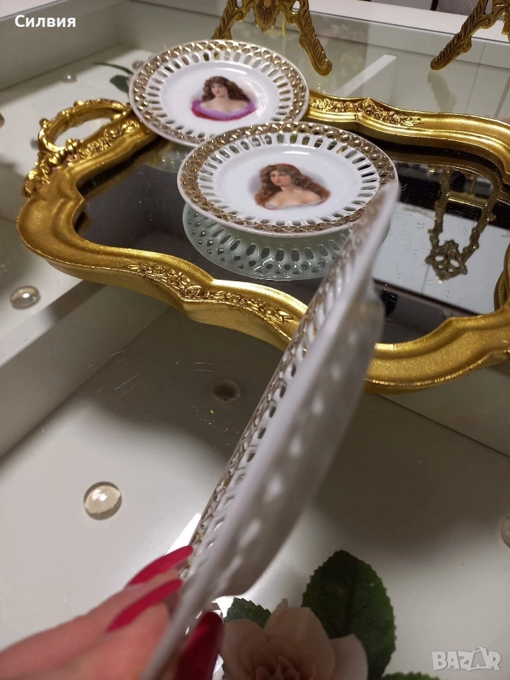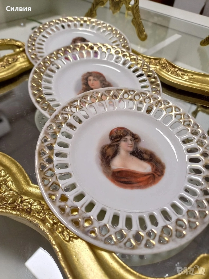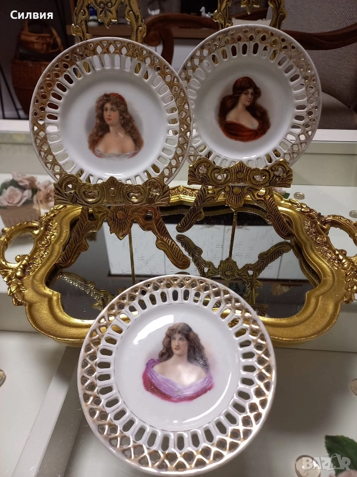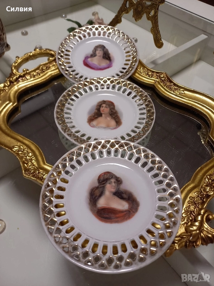 Винтидж малки чинийки Комплект от три малки декоративни чинии, украсени с портрети на жени. Стар, фин и лек порцелан. Нежен ажурен фриз. ♦️Когато купувате употребявани или ретро артикули, моля, очаквайте известно стареене, износване или дребни несъвършенства. Въпреки това за някои стари/ретро предмети това е знакът за стойност. Цена 8️⃣0️⃣лв.40,90 € ⊱❥─❥⊱💜✿⊱╮☆♪ ░L░o░V░e░❥─❥⊱💜✿⊱╮💜☆♪ღ💜ღ꧂ღ