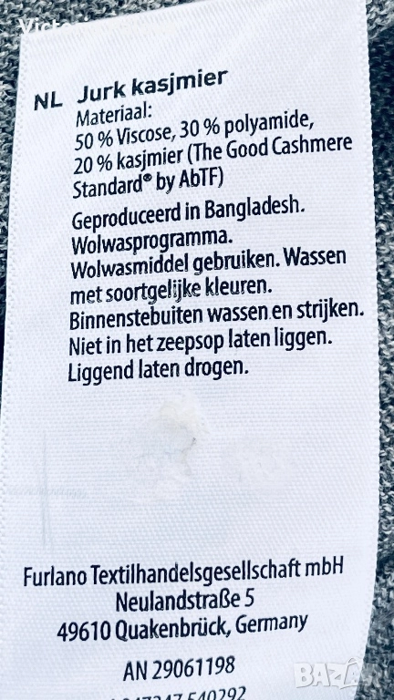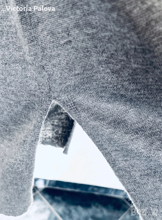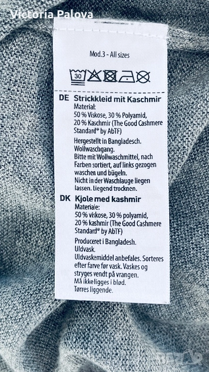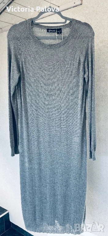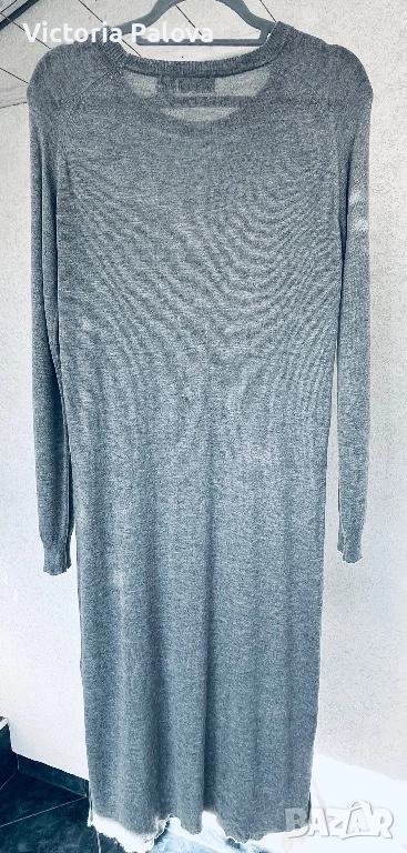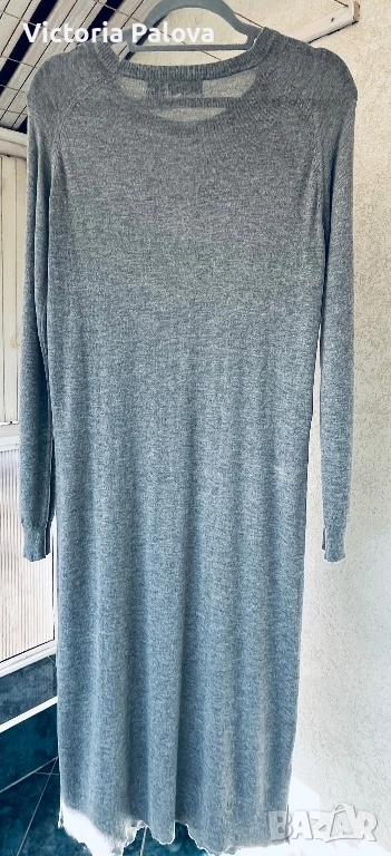 Красива практична рокля в нежен светлосив цвят - Германия, Холандия, Дания с 20% сертифициран устойчив кашмир ( The Good Cashmere Standart by AbTF). Удължен модел с кръгло деколте и дълги ръкави - тънка и лека, но достатъчно топла благодарение на кашмира, с идеално гладка повърхност, пада меко и елегантно по тялото, идеална за ежедневно носене самостоятелно или с клин. ГО - 52-53см, дължина - 115-116см, цепки от двете страни - - 19см.