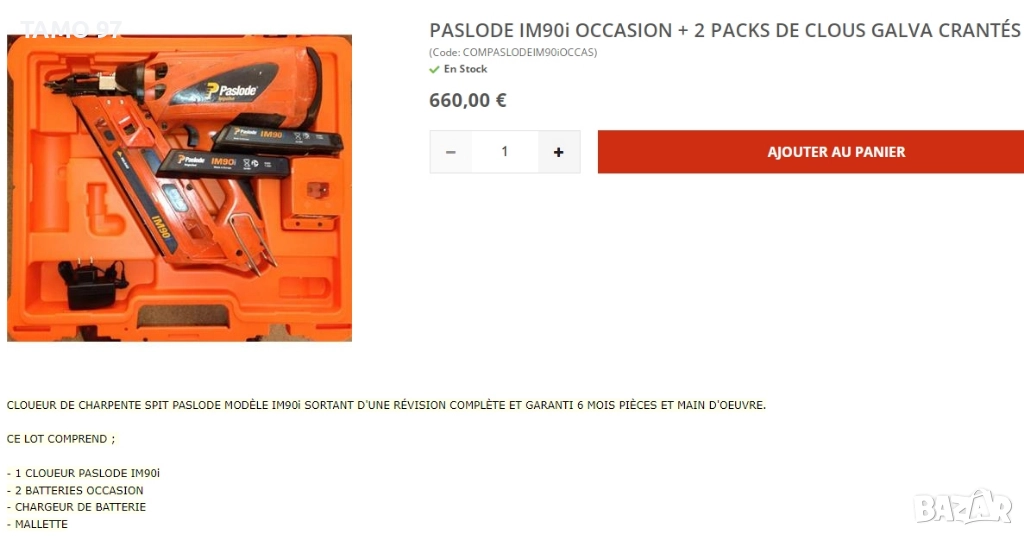 Продавам акумулаторен пистолет за пирони за дърво на Paslode, машината е в отлично визуално състояние и си работи перфектно и без никакви забележки. Такера работи с батерия и газ едновременно, внос от Франция. Обявената цена включва такер, 2 батерии 6.0V 1.5Ah, 2 флакона газ, зарядно устройство, пирони за проба и оригинален куфар. Пращаме с опция преглед и тест с куриерска фирма еконт може и лично предаване за гр. Шумен. Втора ръка в чужбина са продава за: 660евро