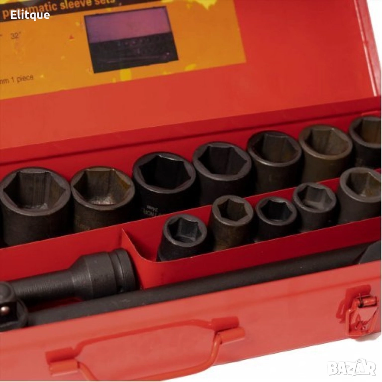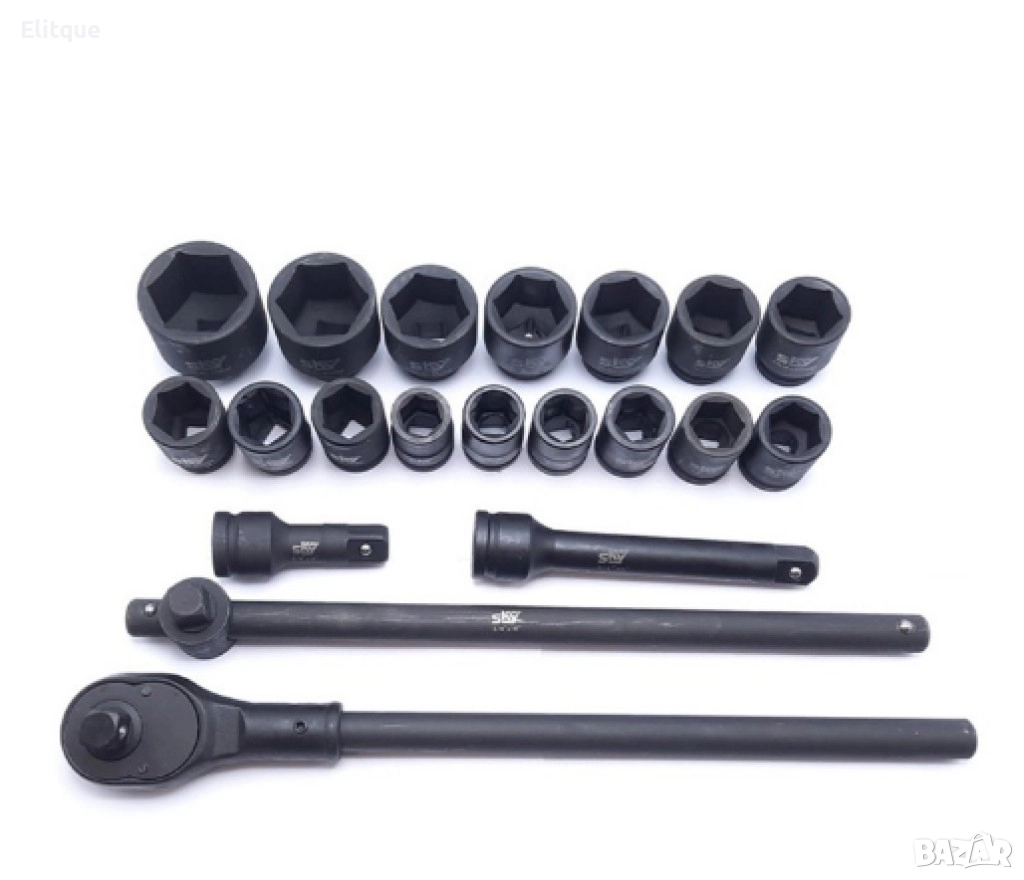 Комплектът включва: Вложки: Размери 19мм, 21мм, 22мм, 23мм, 24мм, 27мм, 28мм, 30мм, 32мм, 34мм, 36мм, 38мм, 41мм, 46мм, 50мм; Удължители: 100мм и 200мм.; Върток: Т-450мм.; Тресчотка: За лесно и бързо затягане и разхлабване на болтове и гайки.
