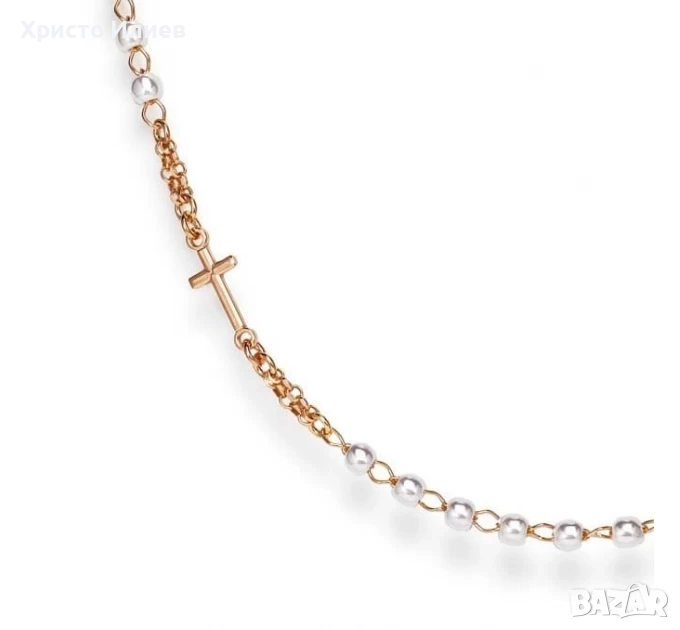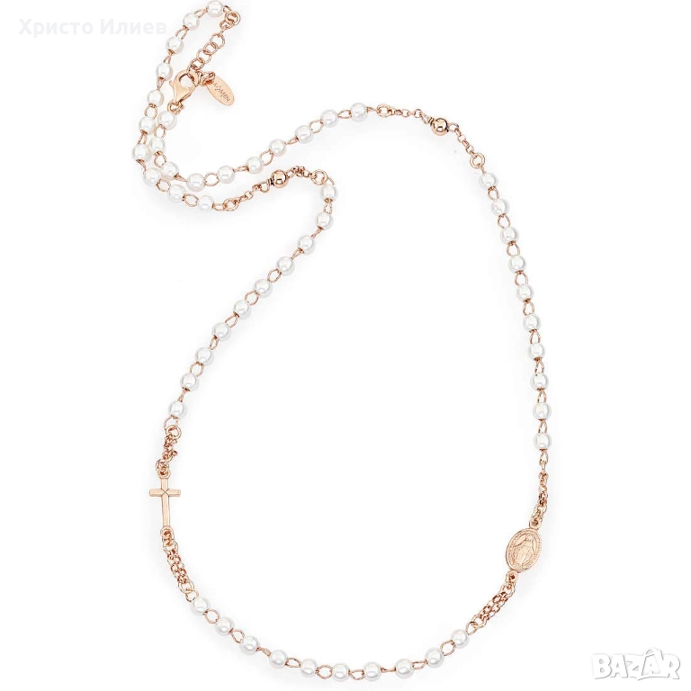 Дамско златисторозово колие с нежни бели перли, декорирано с кръст и овална плочка с Дева Мария.