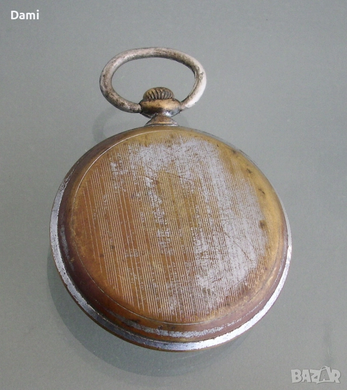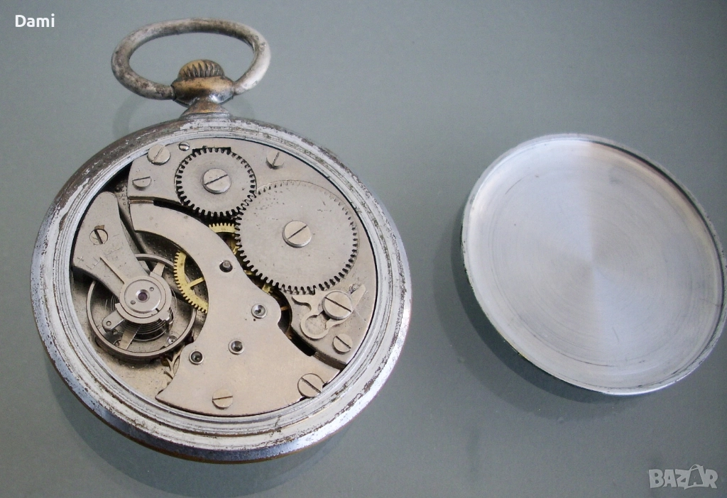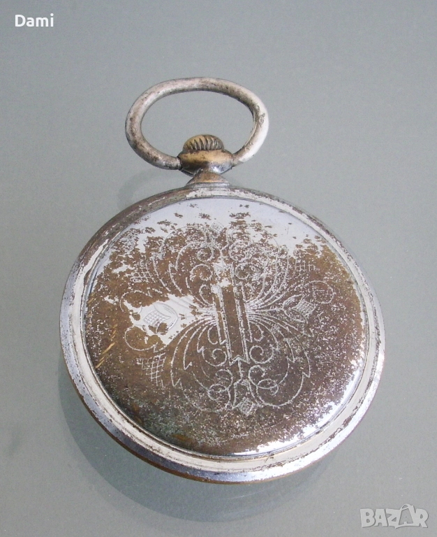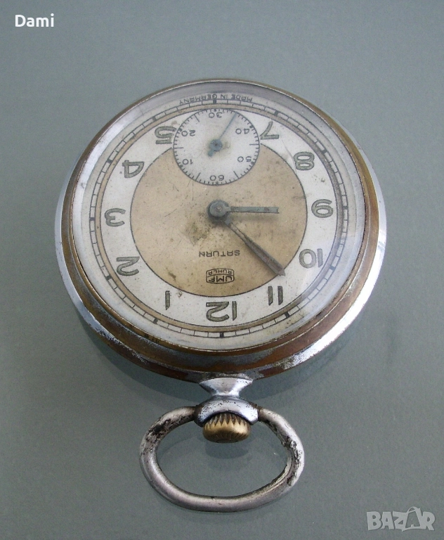 Saturn на Umf Ruhla - мъжки, джобен, около 1950 год., със секундарен малък циферблат, никелиран бронзов корпус със следи от употреба видни на снимките, каса 50 мм, златисто-бял циферблат с релефни арабски числа, тъмносини стрелки, минутната е счупена по средата, надписи " Umf Ruhla Saturn Made in Germany ", стъклото с малка драскотина, два задни капака с орнаменти. Часовникът не работи.