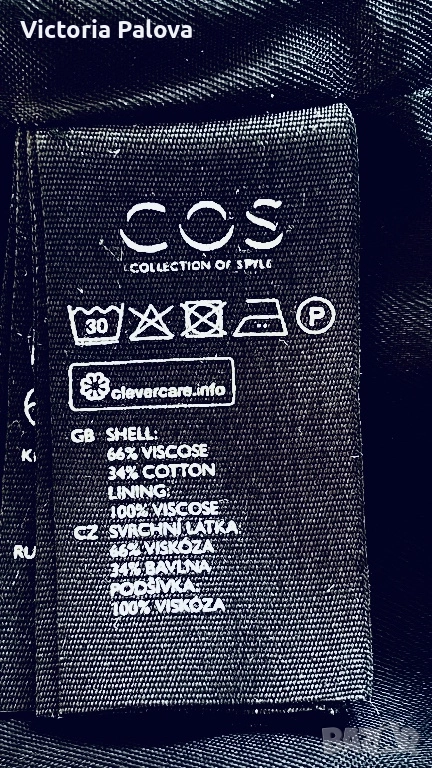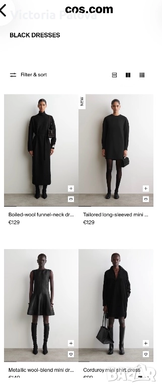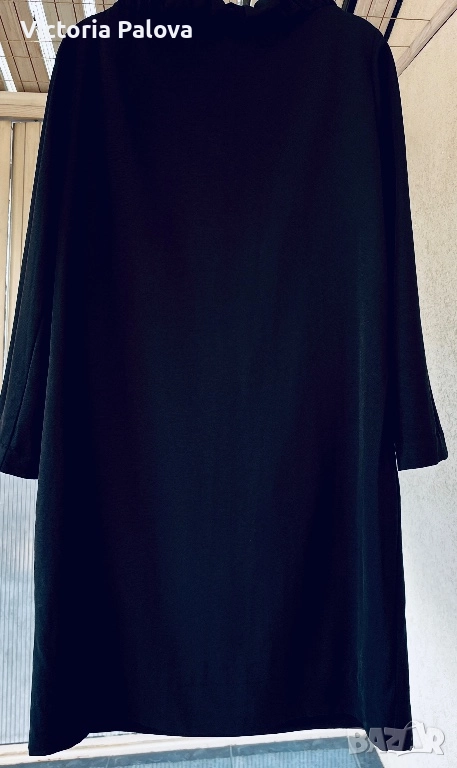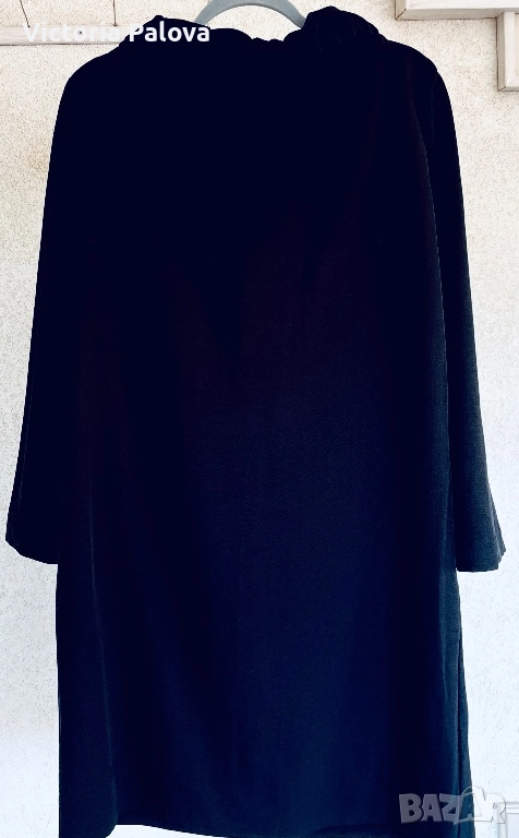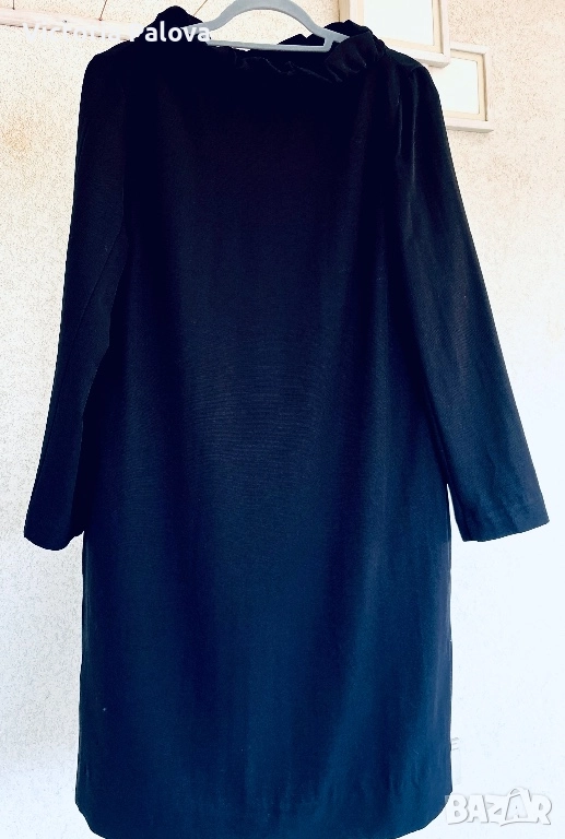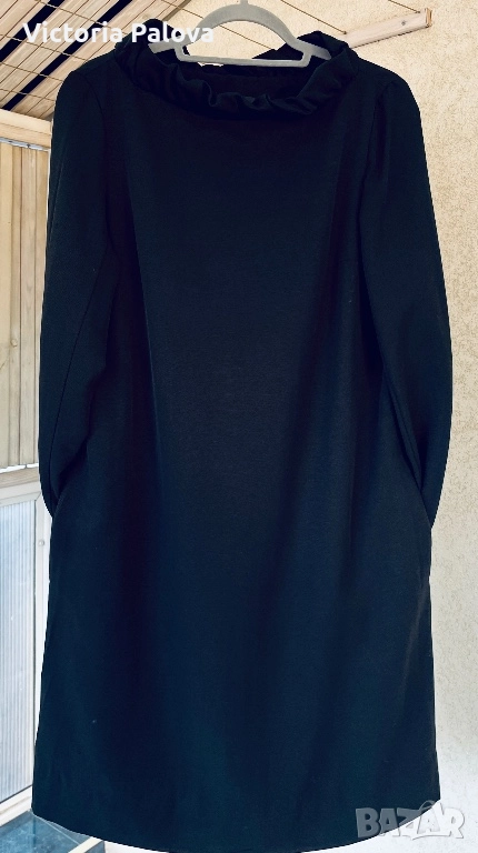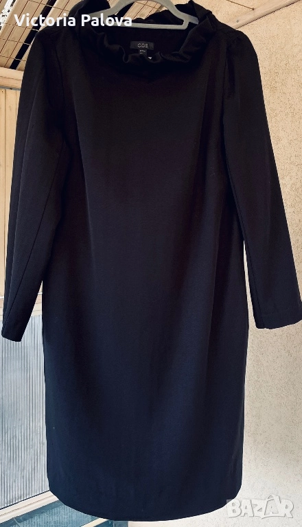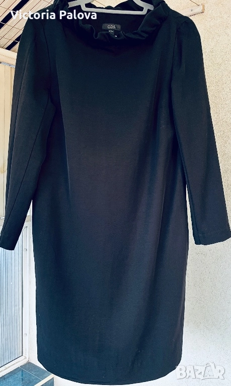 Елегантна черна рокля от COS - марка, известна със своя интелигентен дизайн, скандинавски минимализъм и високо качество на изработката. Роклята е с изчистена линия, леко структурирана форма, вътрешни джобове, подплата, гладка материя ( не лепне и е много приятна) и невероятен детайл - якичка, оформена като деликатна вълна около деколтето - архитектурен трик и скулптурно усещане, присъщо на дизайнерския почерк на COS. Тази якичка омекотява строгата линия на роклята и добавя дискретна елегантност, без да нарушава минималистичната визия. Рамо - 42см, ГО - 52см, дължина - 93см, ръкав - 58см.