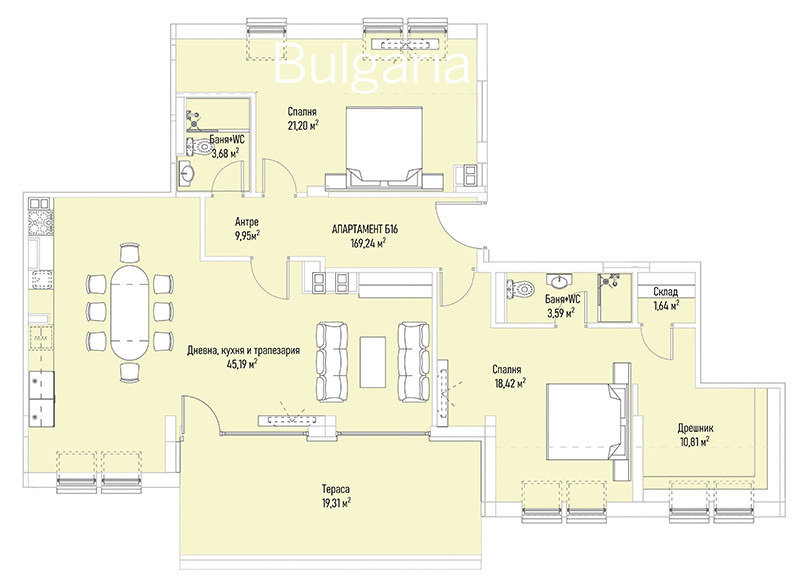 Разпределение:антре, дневна с кухня и трапезария, спалня с баня и тоалетна, втора спалня с баня и тоалетна и дрешник,склад, тераса.