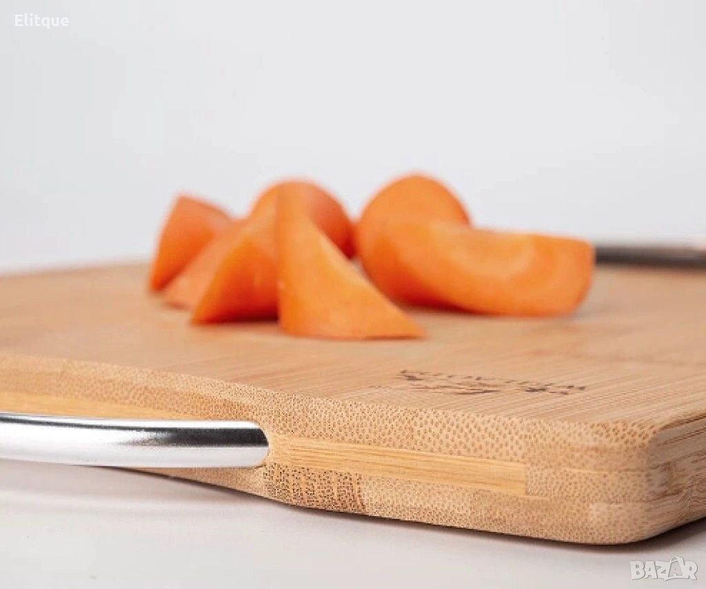 Изработена от висококачествен бамбук, дъската е изключително издръжлива и устойчива на влага, което я прави идеална за ежедневна употреба. Ергономичната дръжка осигурява лесно пренасяне и стабилност при рязане, докато естествената красота на бамбука добавя елегантност на вашето кулинарно пространство. Повърхността на дъската е щадяща за ножовете, като същевременно не задържа миризми и петна.
