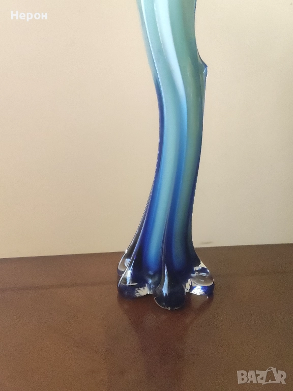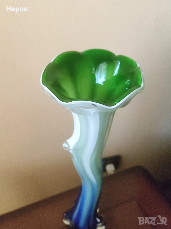 Ръчна изработка, произход остров Мурано, Италия, период 1960 - 1970 г. Вазата се отличава с впечатляващи размери и майсторска преливка на цветовете - от наситено зелено в чашката, през млечно бяло, до морско синьо в основата. Истинско произведение на изкуството, подходящо както за колекция, така и за акцент в модерен интериор.